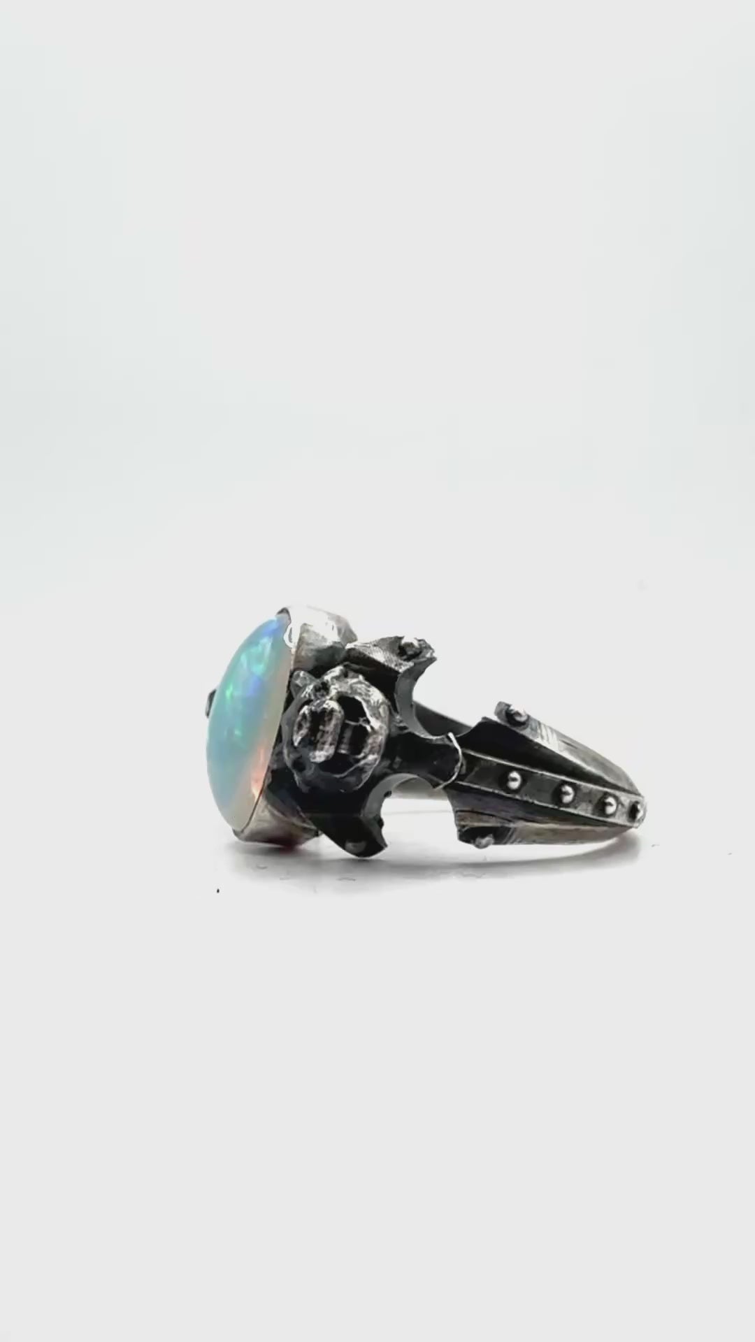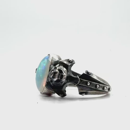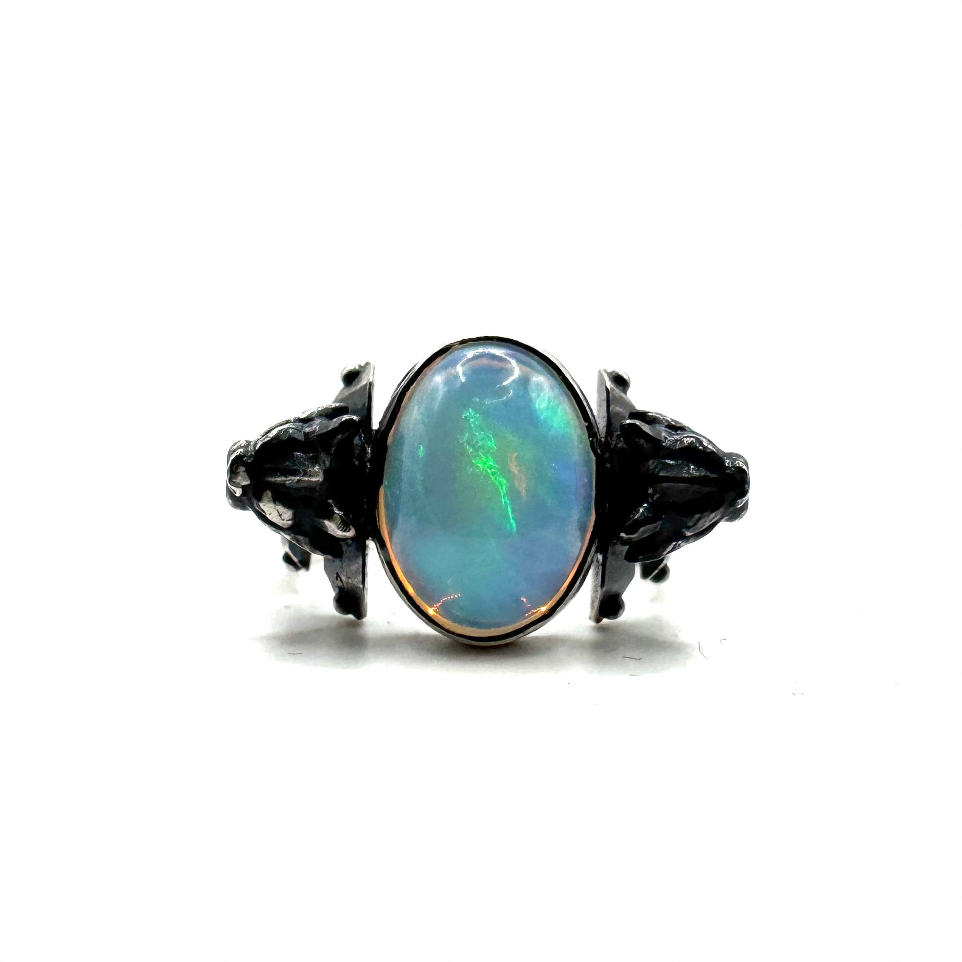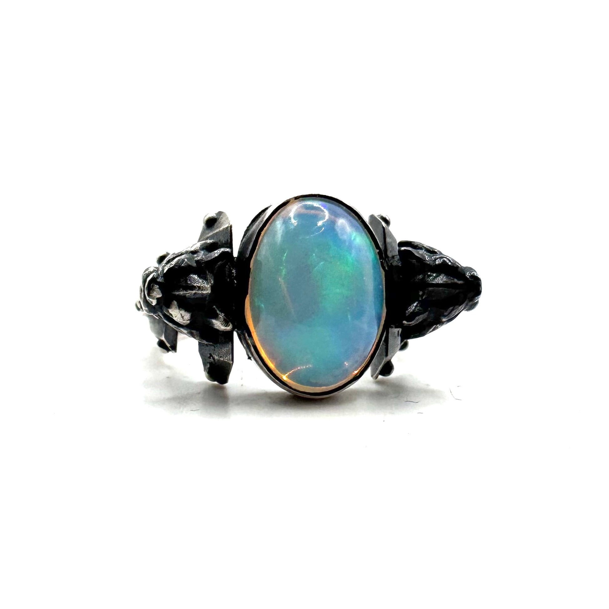 This ring is set with a beautifully saturated opal with insane color play. It reminds me of the Arken stone. Set into a unique variation of the sentinel ring. The ring has been hand textured to hold the oxidation. As it ages the oxidation will wear off on high points, but stay nice and dark in the recesses. This evolves the piece over time and makes it completely unique to the wearer.