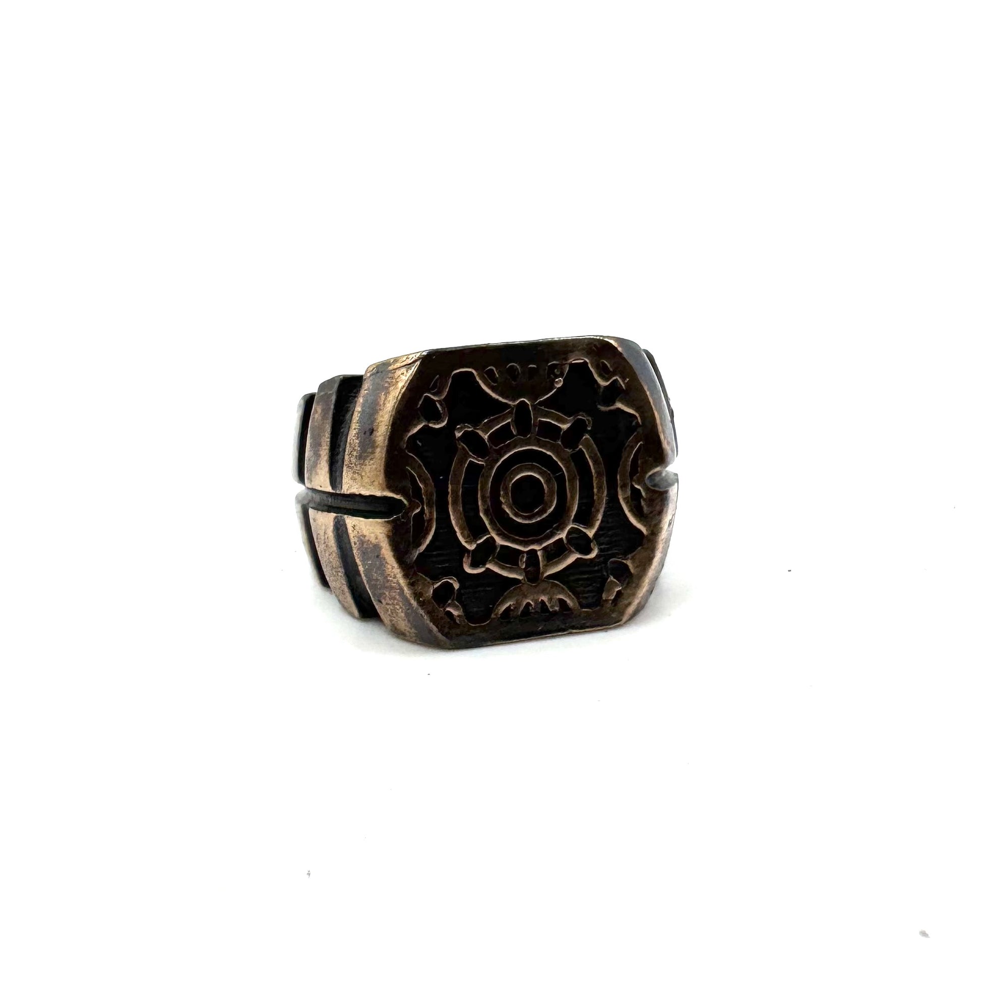 This geometric signet ring is crafted from antique metal stamps passed down from my grandmother, who traveled to India 60 years ago. These stamps, handmade with intricate geometric patterns, were preserved in her antique collection until I began my journey into metalsmithing. The pattern on this ring is a digitized version of the original stamps, creating a sigil-like design that’s truly unique. The finish is oxidized and then carefully sanded to reveal the rich bronze color, leaving the oxidation in certain areas to create stunning contrast. Cast in solid white bronze, each ring is crafted with meticulous attention to detail, carrying both historical significance and a sense of timelessness.