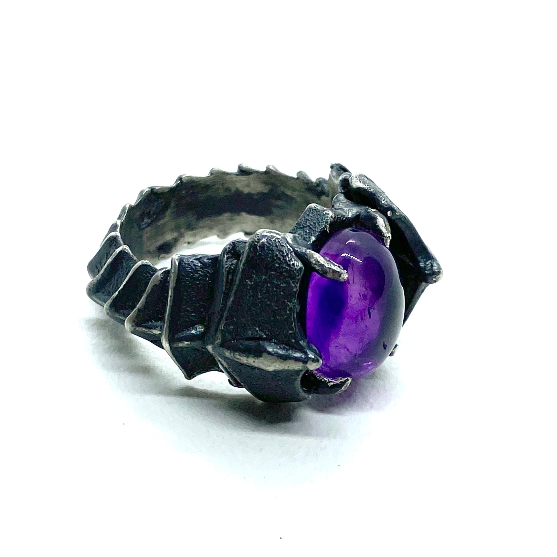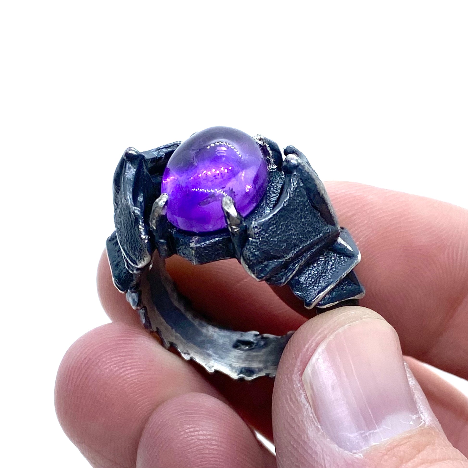 This armored sterling silver ring boasts an incredible presence with its hand-textured plates and oxidized dark finish. The cabochon is securely set in an armored setting, adding both protection and striking visual appeal. Over time, the oxidation will wear away at the high points, leaving the recesses darker and creating a unique, evolving look with each wear. Crafted in solid sterling silver, this bold ring combines rugged texture with elegant design, making it a powerful statement piece for any collection.