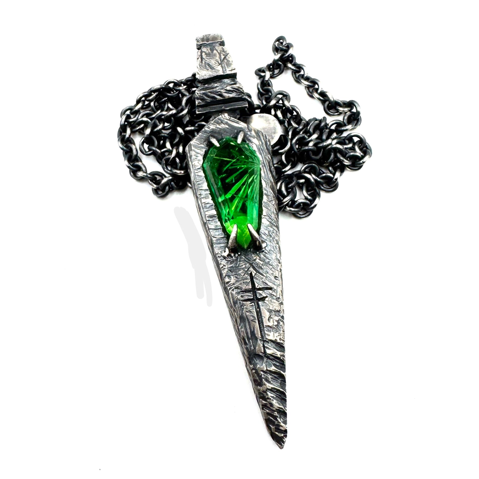 This is a heavy weight pendant made with a huge green bridewell stone. It’s hand carved to be a talisman of protection and power. It measures about 4 inches long and the chain is a heavyweight sterling silver cable chain that measures 24 inches. It is incredibly soft and smooth with a perfect weight.