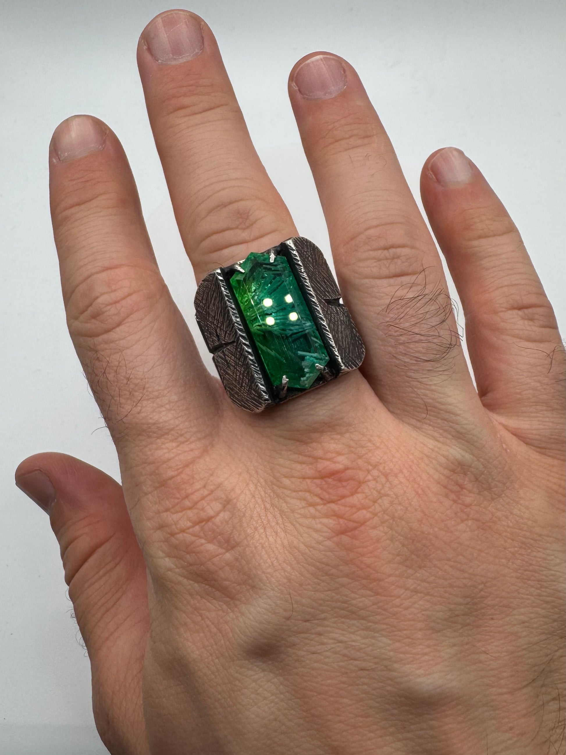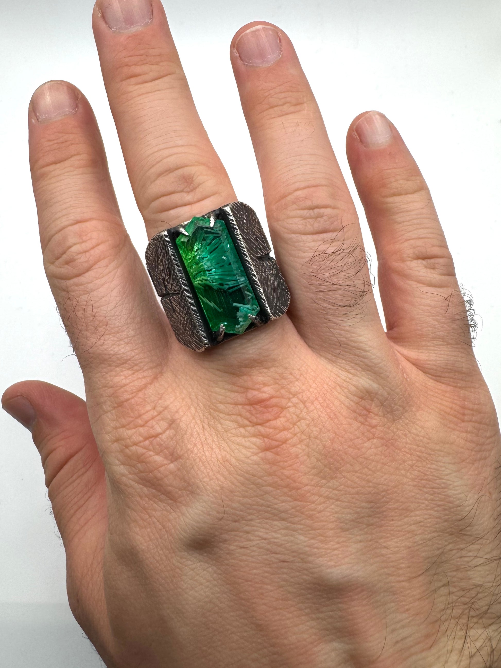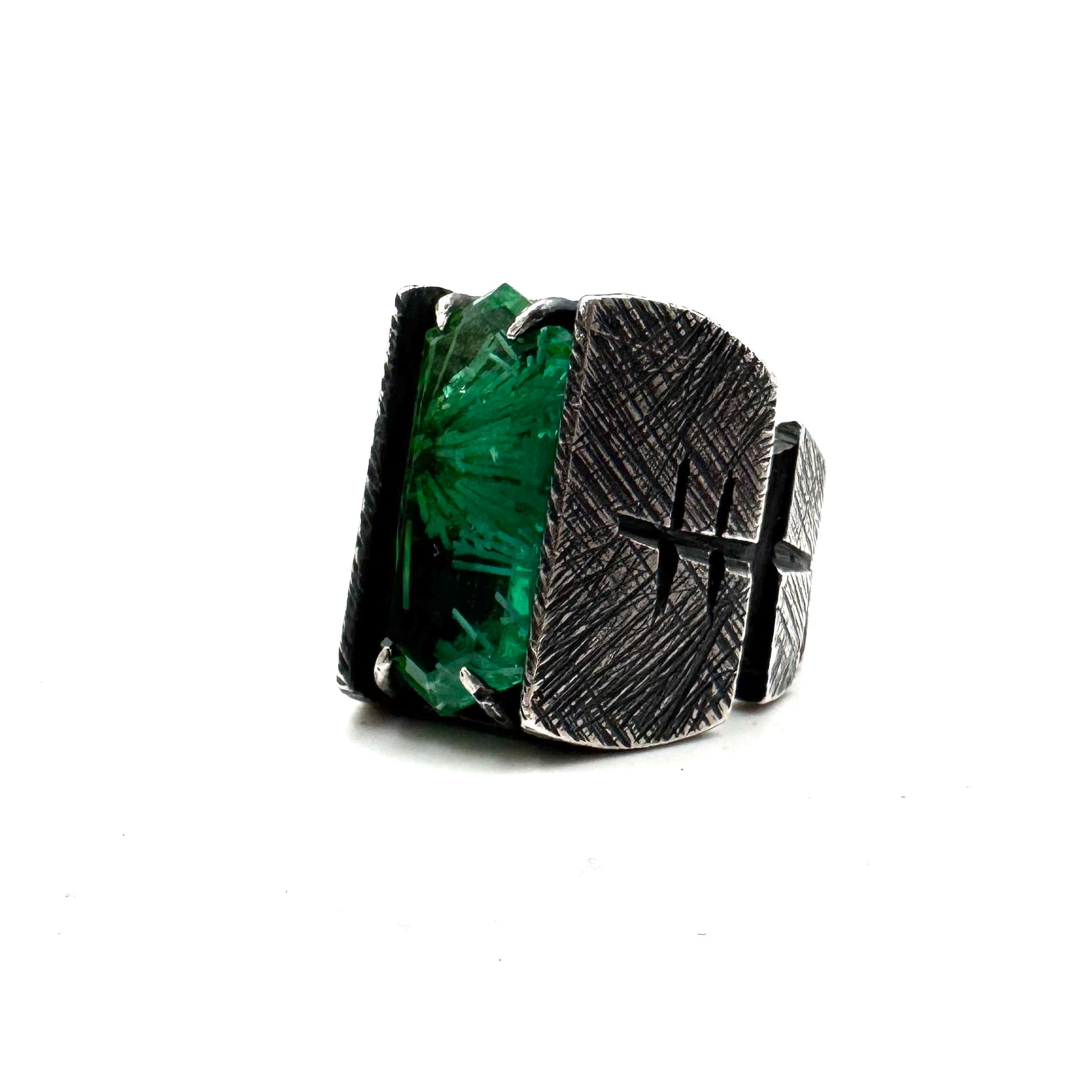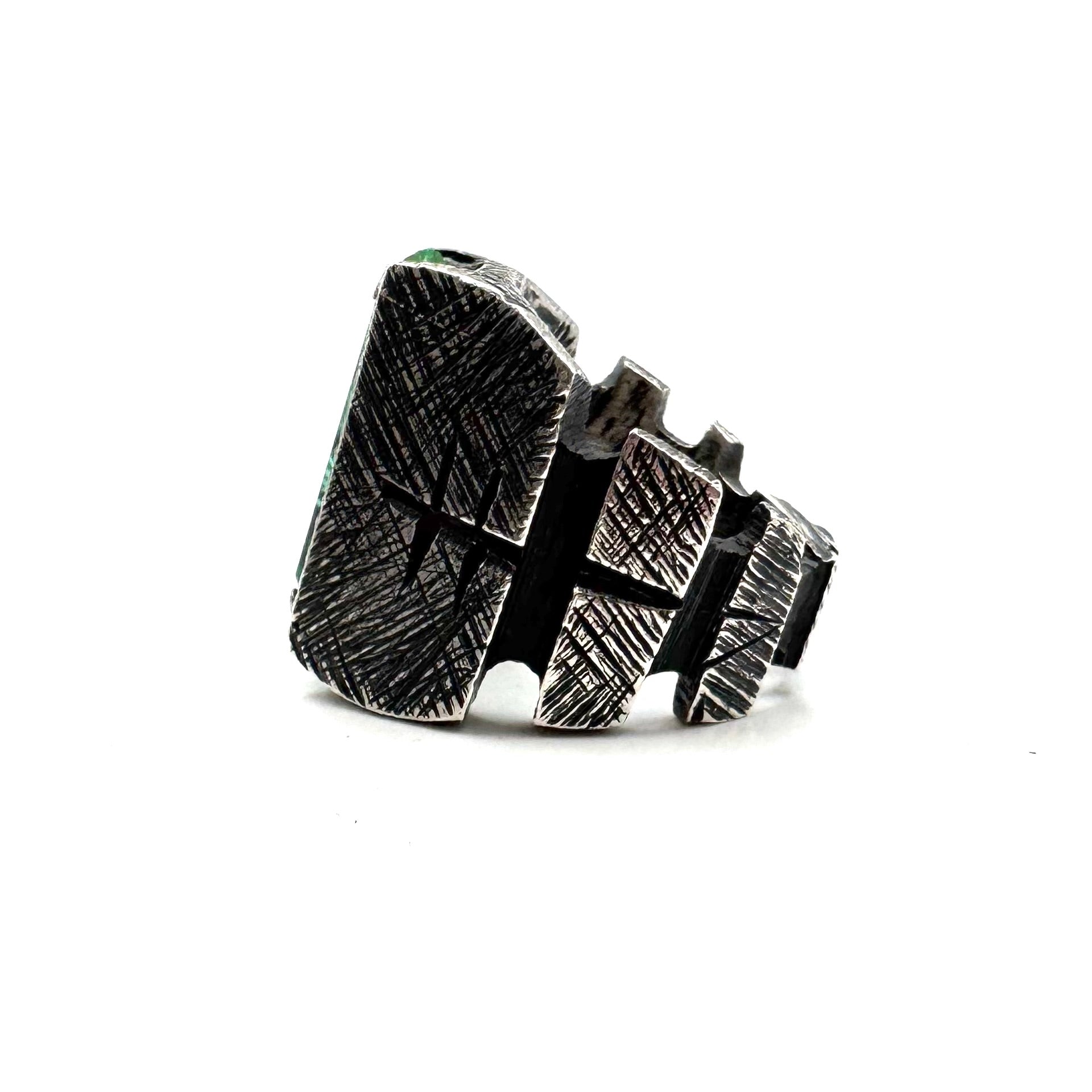 This piece has been hand carved and cast in solid sterling silver. Each piece is hand finished with a blackened oxidation that is coated in a clear lacquer to preserve it for longer. Over time the oxidation will wear away in the highest points and stay darkest in the deeper recesses. This will make for a piece that evolves with its wearer over time. The central stone is a green Bridewell stone.