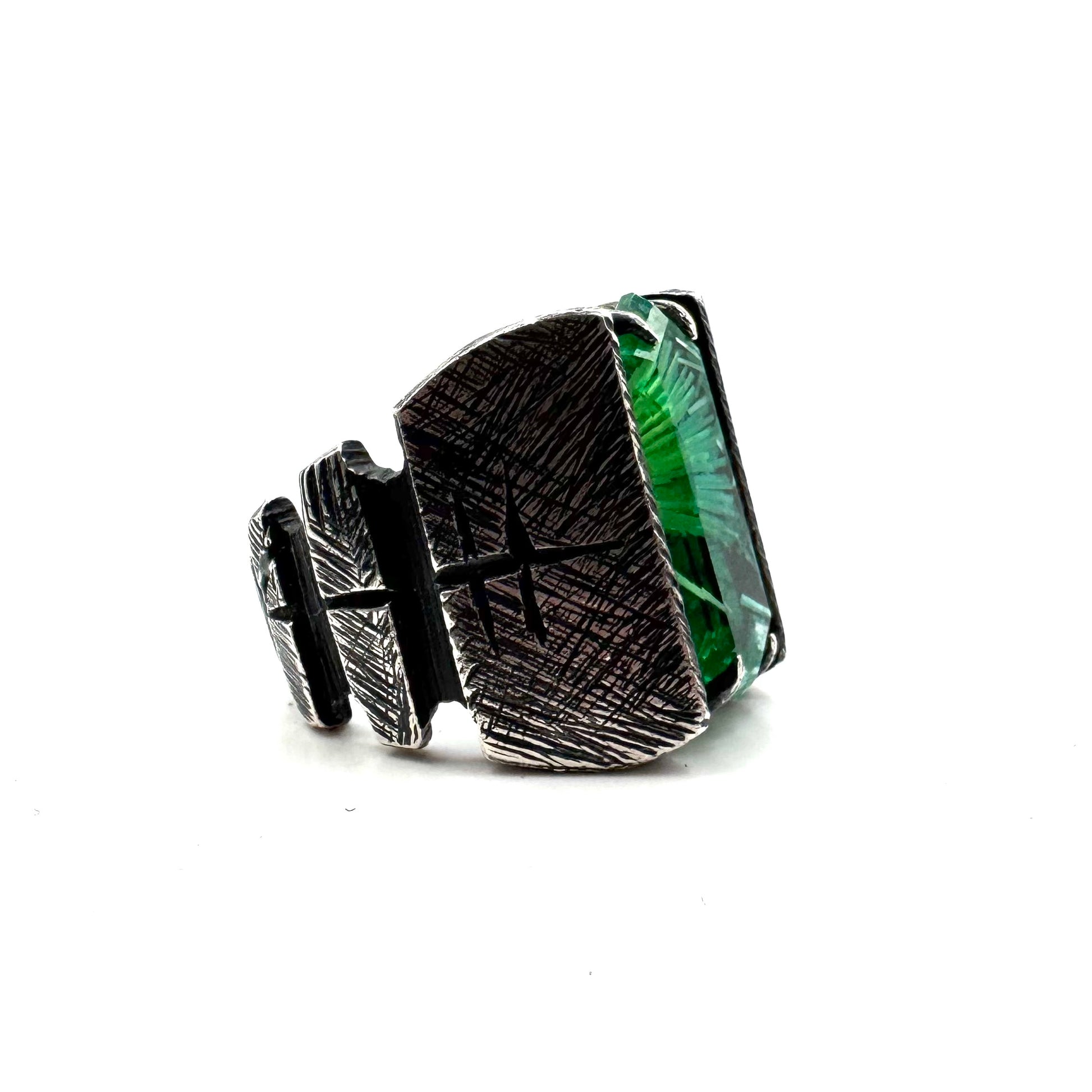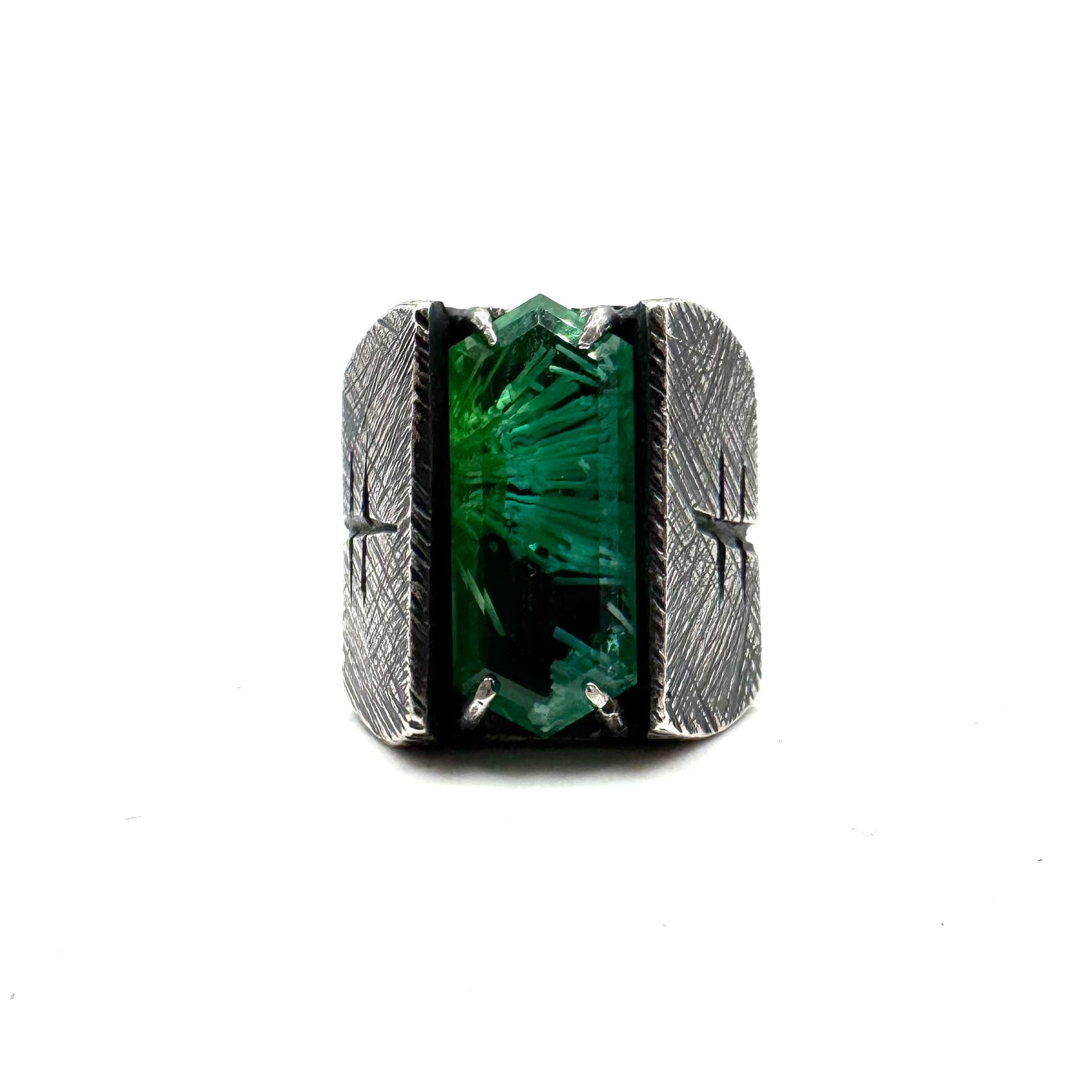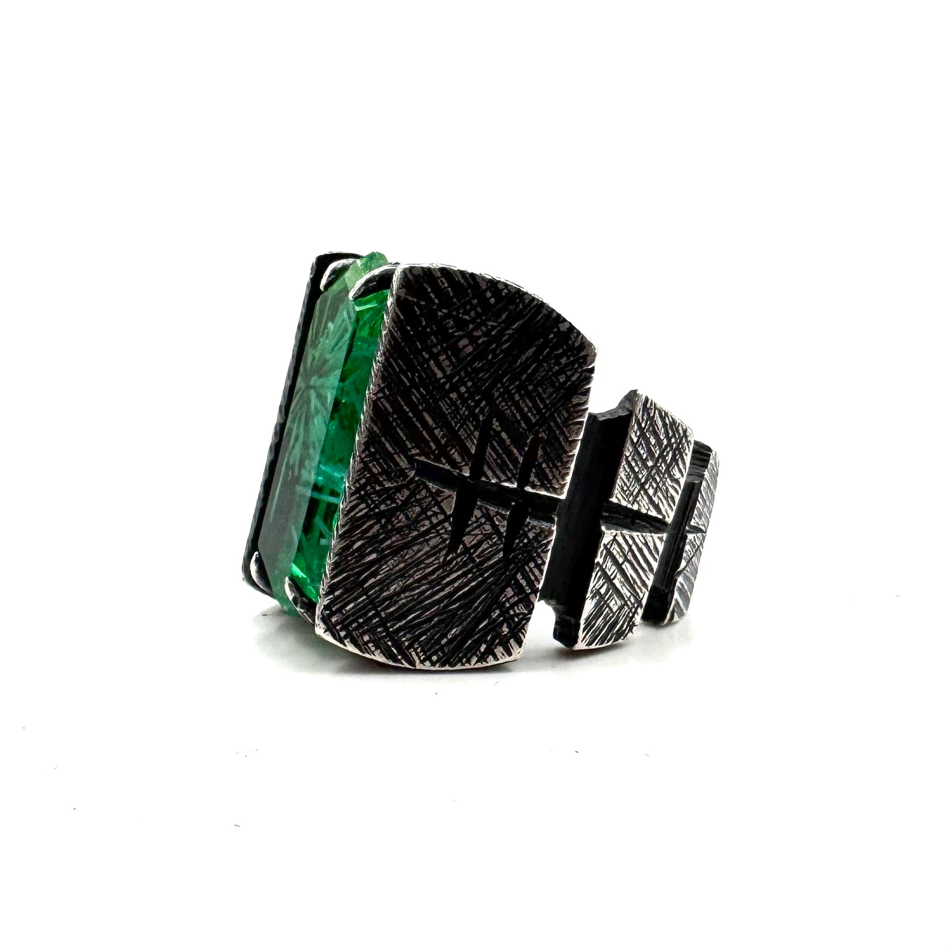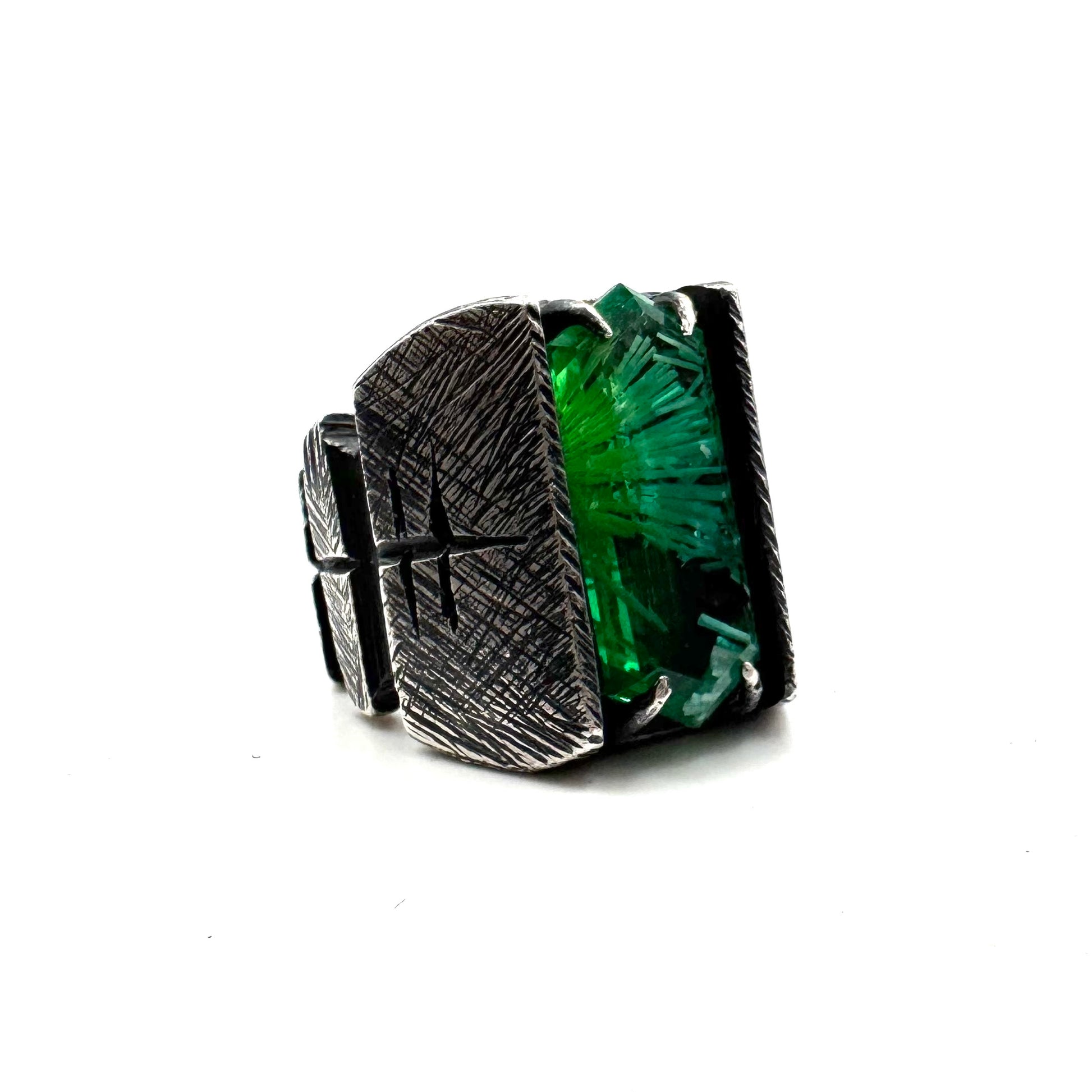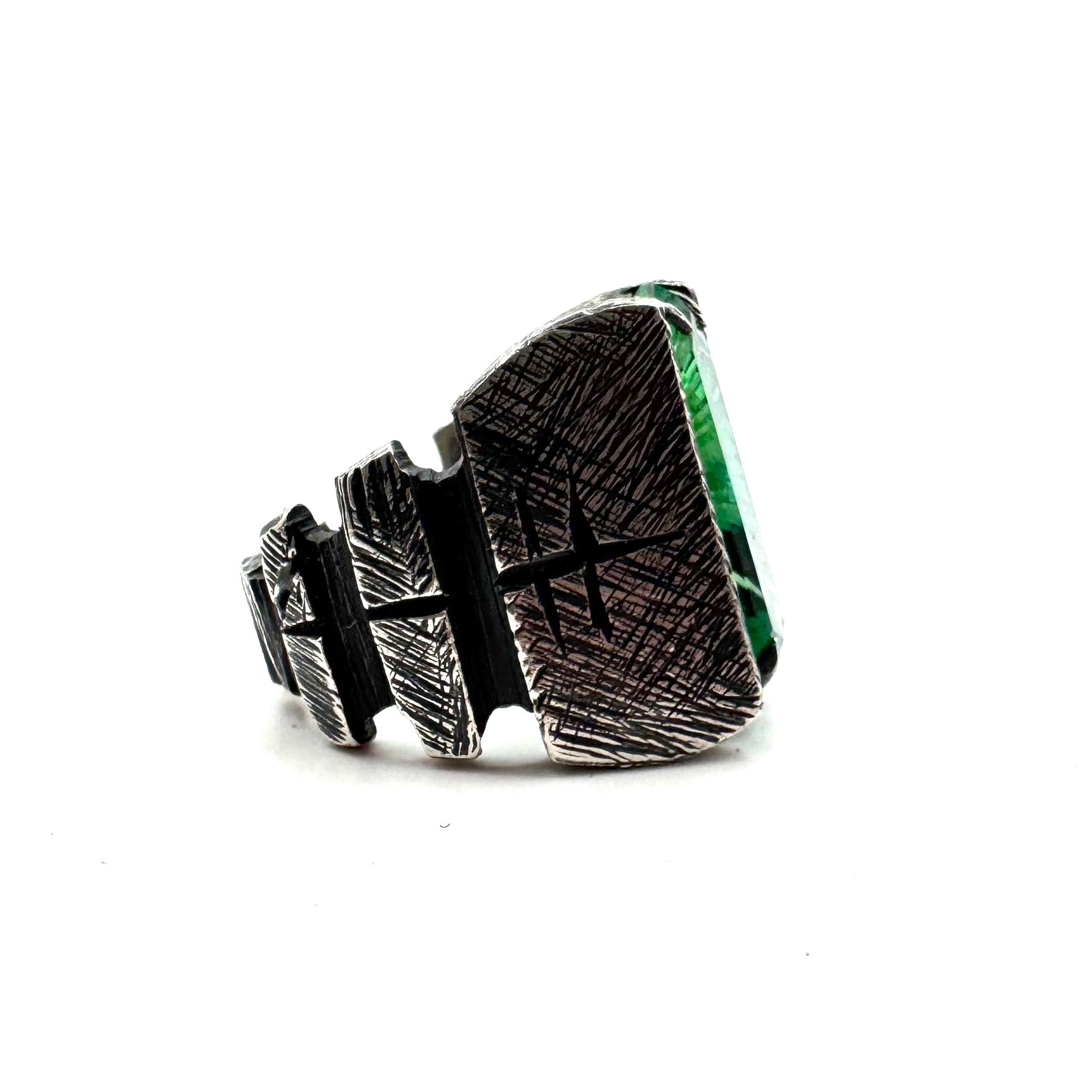 This piece has been hand carved and cast in solid sterling silver. Each piece is hand finished with a blackened oxidation that is coated in a clear lacquer to preserve it for longer. Over time the oxidation will wear away in the highest points and stay darkest in the deeper recesses. This will make for a piece that evolves with its wearer over time. The central stone is a green Bridewell stone.
