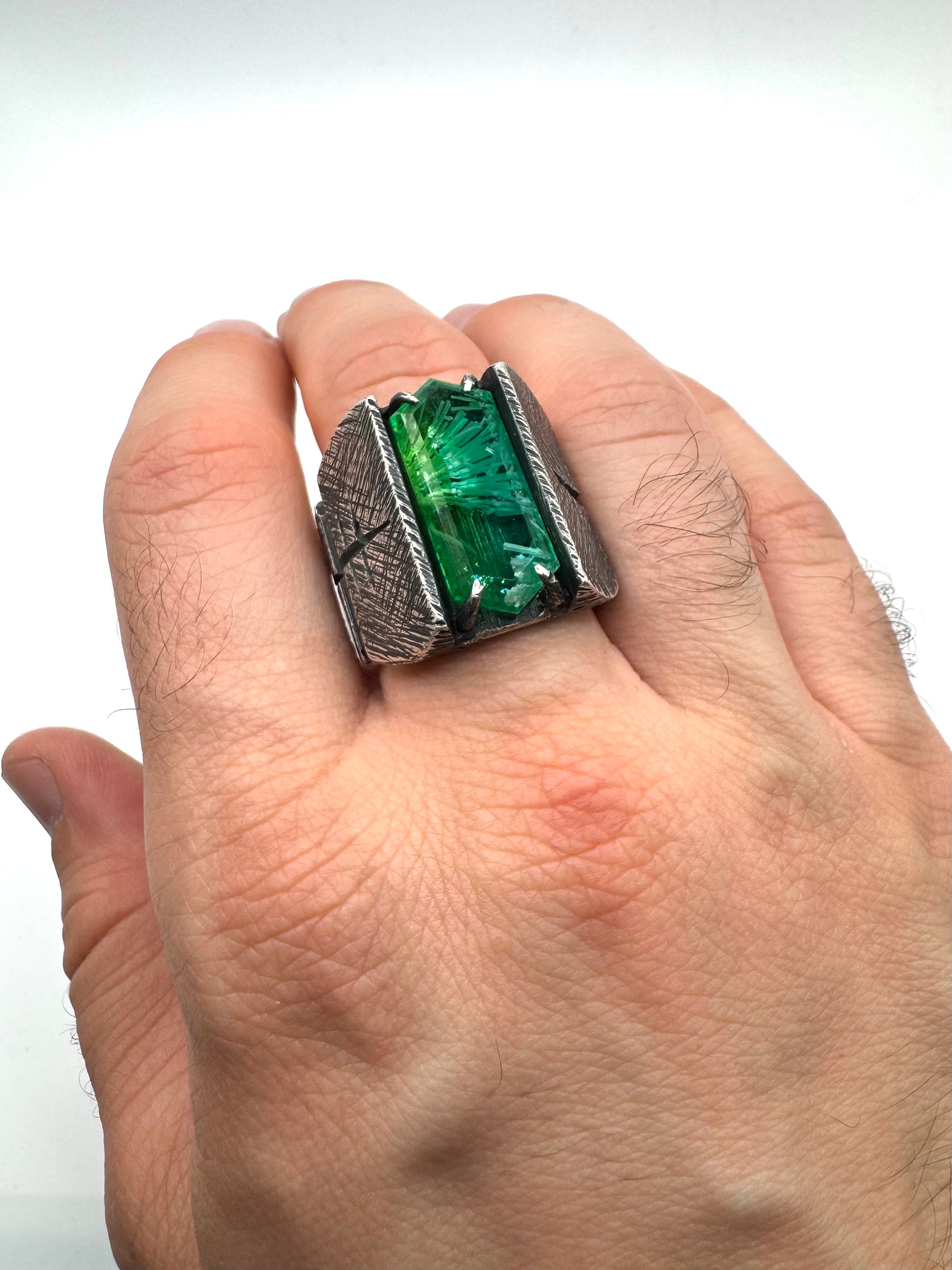 Bridewell stone is created by melting and slowly reforming quartz and other natural minerals at volcanic temperatures. As the liquified silicate cools, the crystalline inclusions bloom out of the molten magma like a flower. No two stones are ever exactly alike. This piece has vivid color to contrast the oxidized metal. I wanted this piece to feel like something found in an ancient tomb. Perhaps from a futuristic civilization.