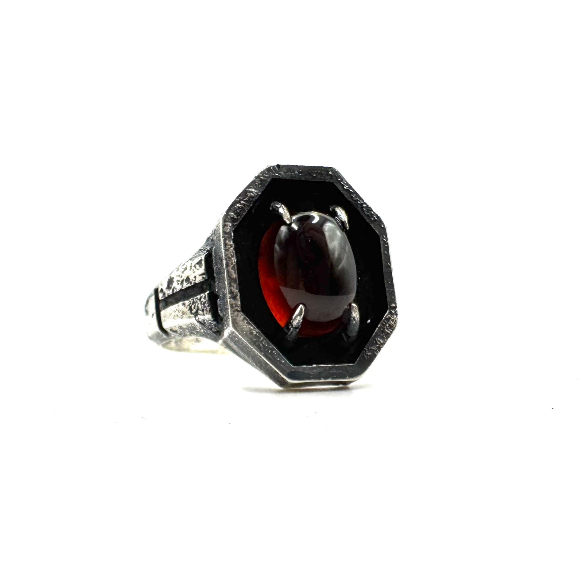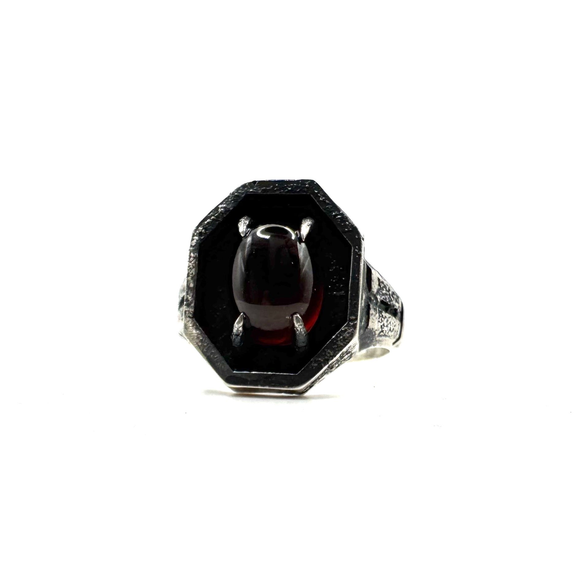 Set with an oval garnet cabochon, this piece has vivid color to contrast the oxidized metal. I wanted this piece to feel like something found in an ancient tomb. Perhaps from a futuristic civilization.