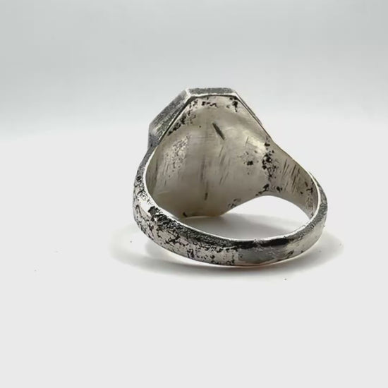 This piece has been hand carved and cast in solid sterling silver. Each piece is hand finished with a blackened oxidation that is coated in a clear lacquer to preserve it for longer. Over time the oxidation will wear away in the highest points and stay darkest in the deeper recesses. This will make for a piece that evolves with its wearer over time.