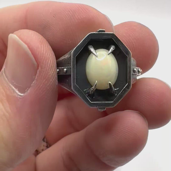 Set with a welo opal cabochon, this piece has vivid color to contrast the oxidized metal. I wanted this piece to feel like something found in an ancient tomb. Perhaps from a futuristic civilization.