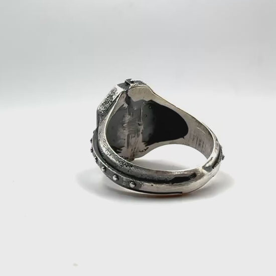 This piece has been hand carved and cast in solid sterling silver. Each piece is hand finished with a blackened oxidation that is coated in a clear lacquer to preserve it for longer. Over time the oxidation will wear away in the highest points and stay darkest in the deeper recesses. This will make for a piece that evolves with its wearer over time.