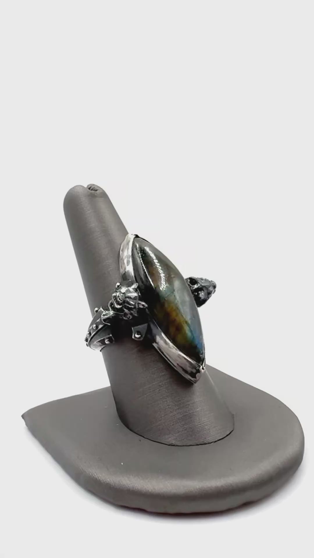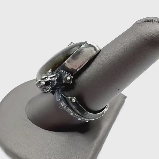 Set with a labradorite cabochon, this piece has vivid color to contrast the oxidized metal. I wanted this piece to feel like something found in an ancient tomb. Perhaps from a futuristic civilization.