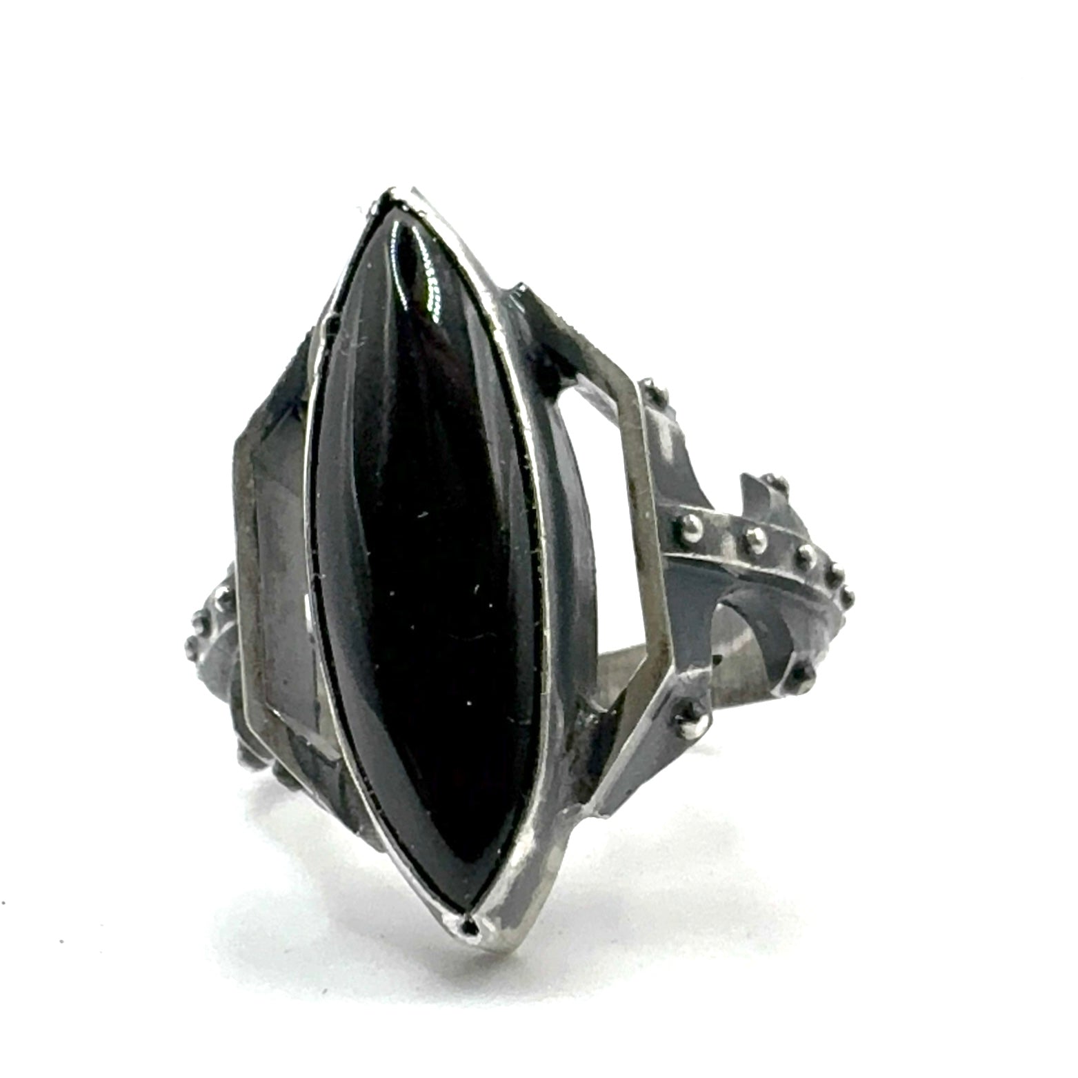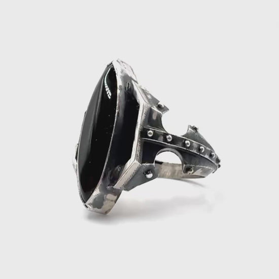 Set with a black onyx cabochon, this piece has vivid color to contrast the oxidized metal. I wanted this piece to feel like something found in an ancient tomb. Perhaps from a futuristic civilization.