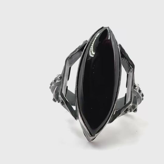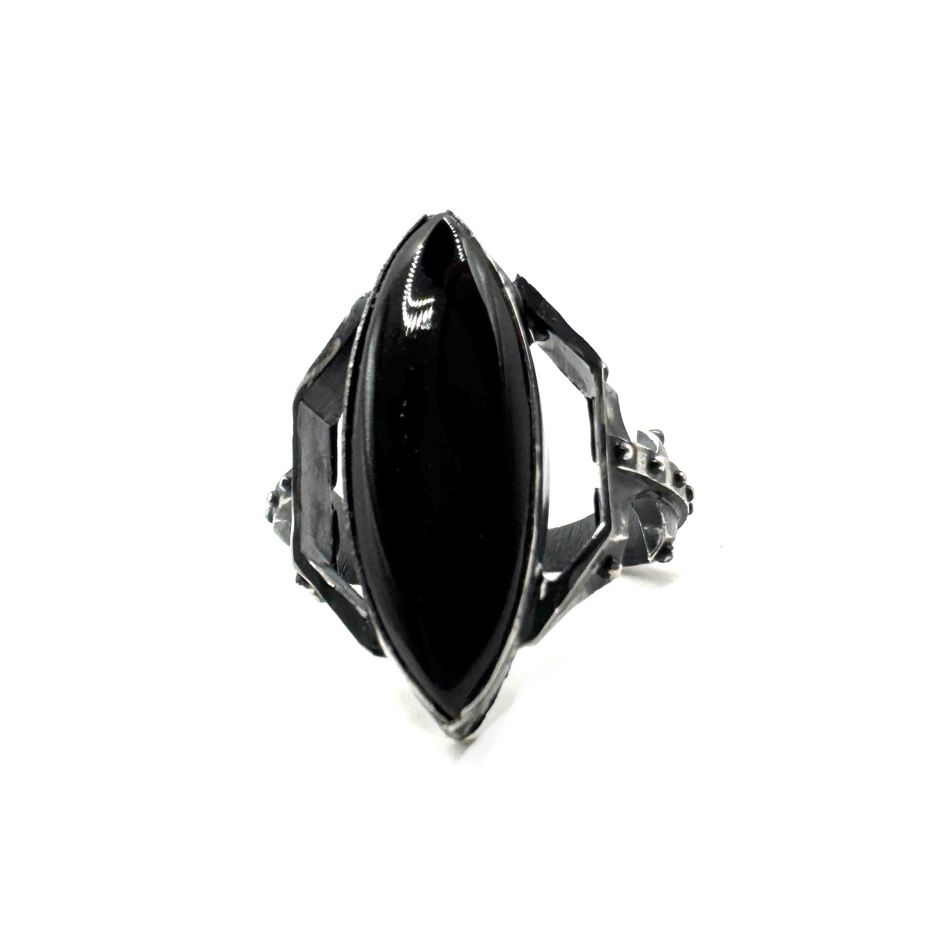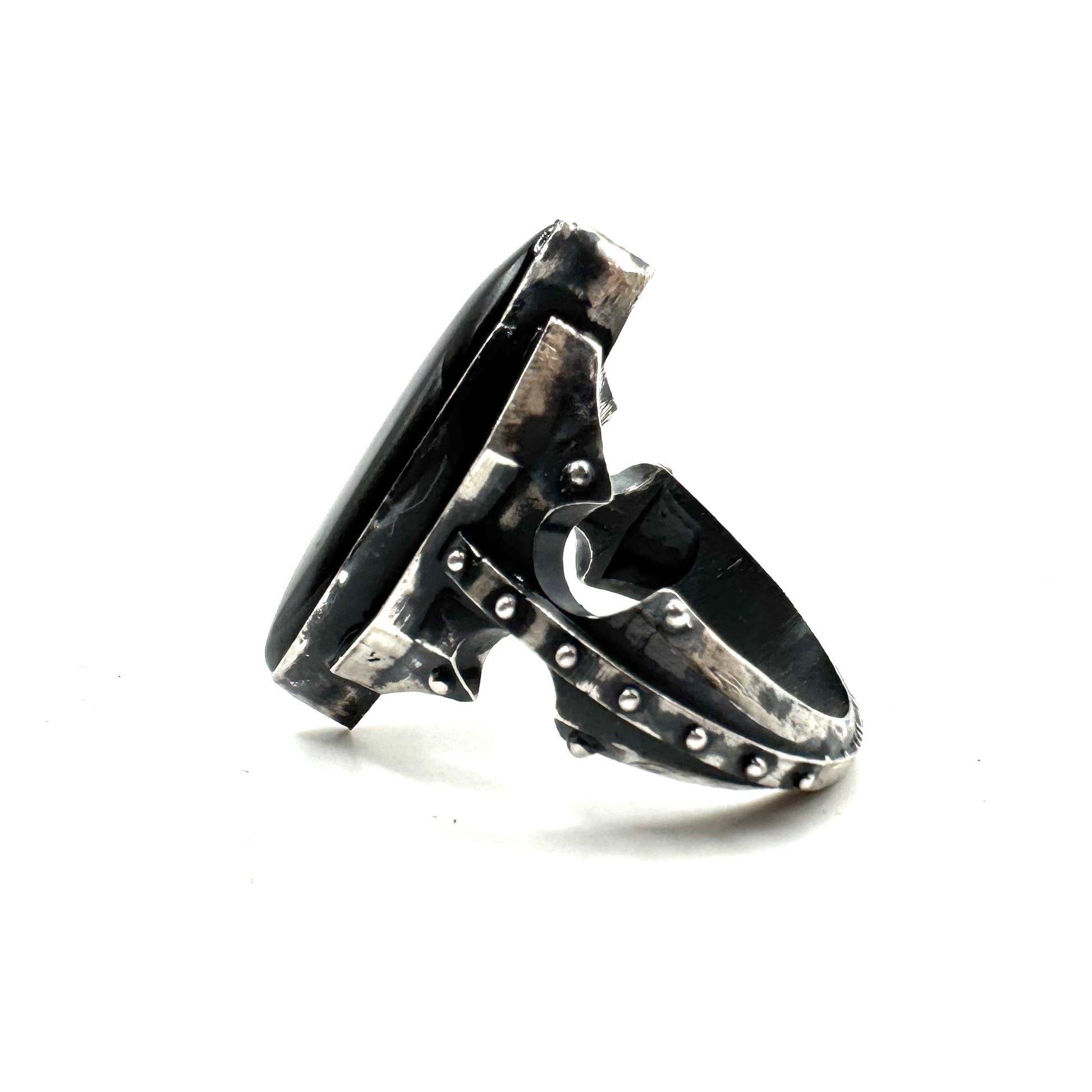 Set with a black onyx cabochon, this piece has vivid color to contrast the oxidized metal. I wanted this piece to feel like something found in an ancient tomb. Perhaps from a futuristic civilization.
