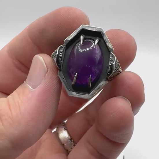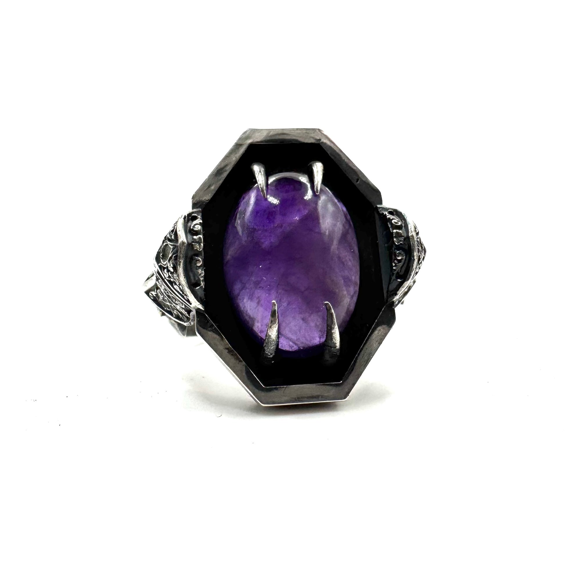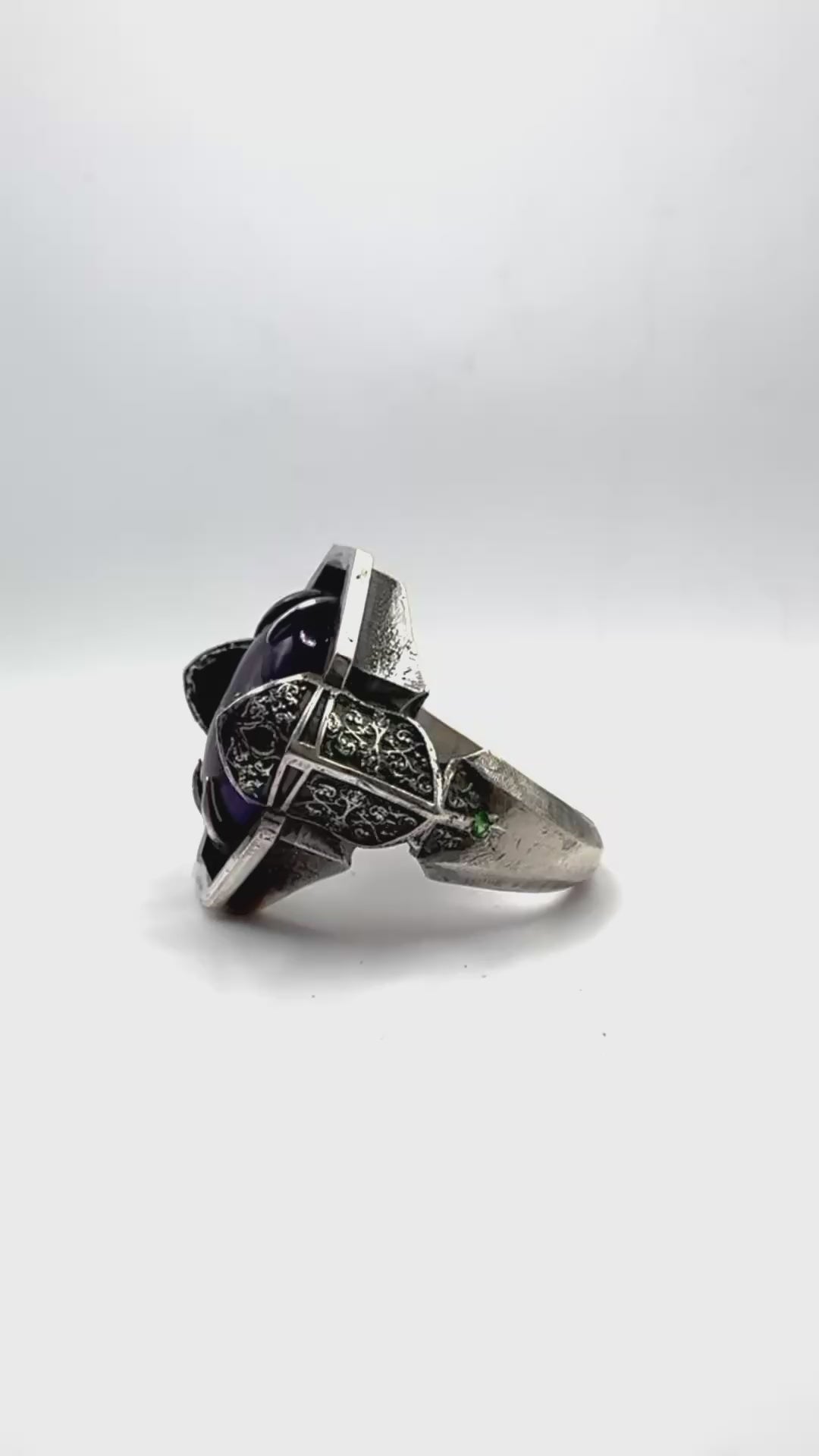 Our Green Knight Ring with Amethyst and Tsavorite in Sterling Silver is a one of a kind set with this gorgeous stone. This ring is a symbol of courage and loyalty, inspired by the legend of the Green Knight.