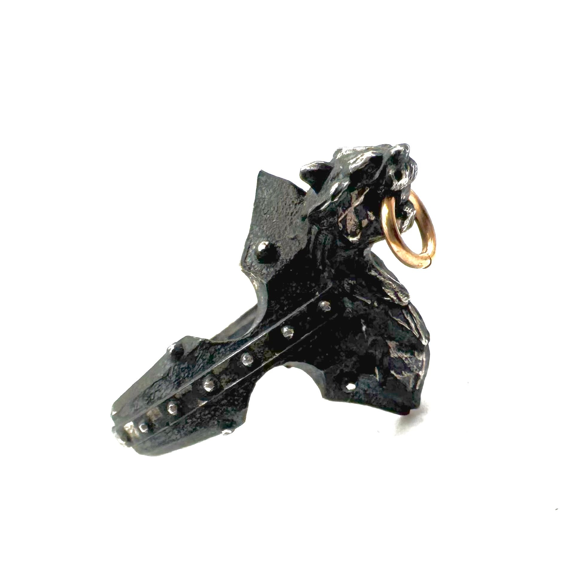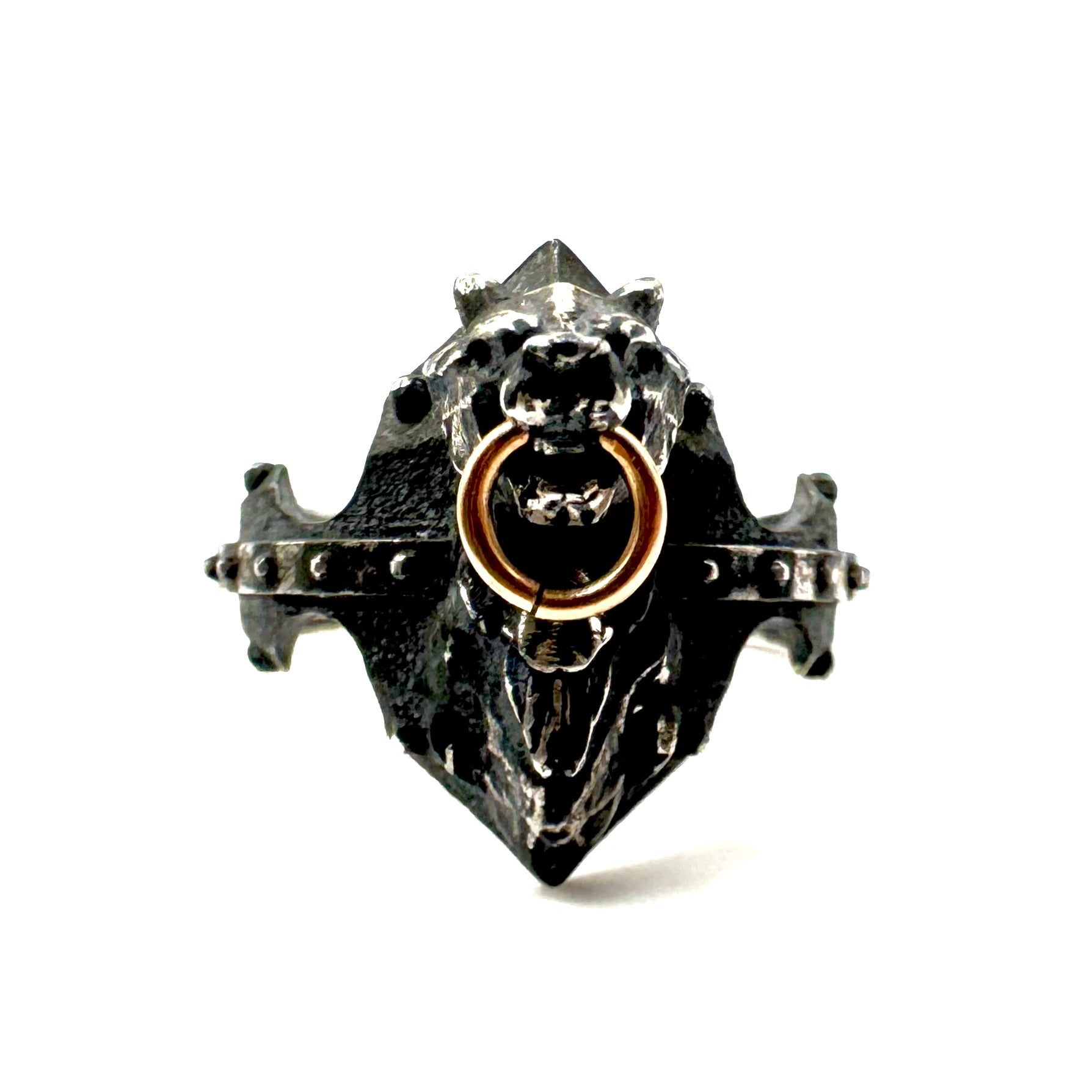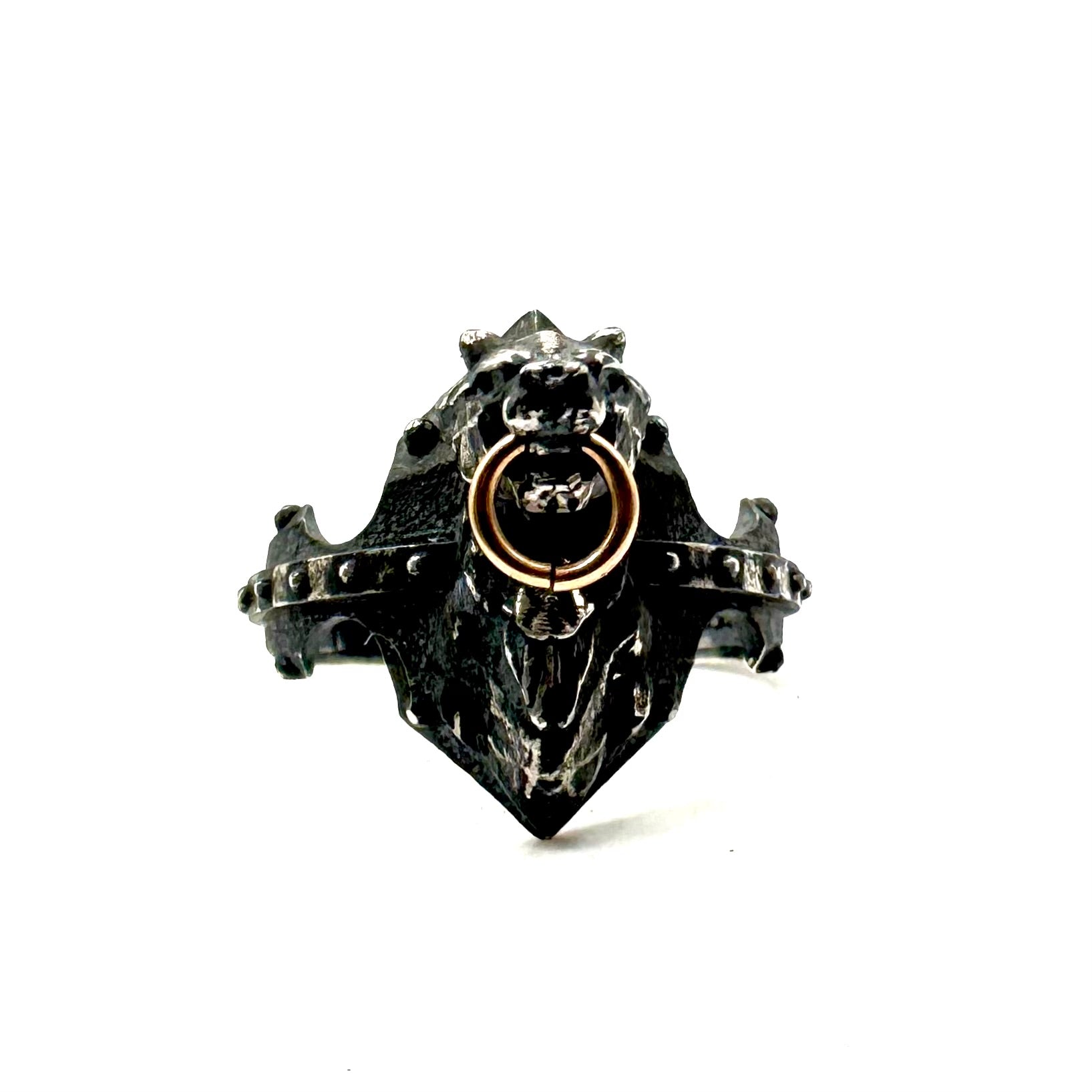The Guardian Ring is a part of the IMPERIA collection. This ring features an intricately detailed gargoyle design crafted in sterling silver, with a distinctive bronze ring held in its mouth like an ancient door knocker. Each ring is hand finished individually with oxidation and hand polished to give it a rustic and worn finish. As this piece is worn it will shine up further on its surface and evolve to its wearer. Available in sizes 6-14, including half sizes.