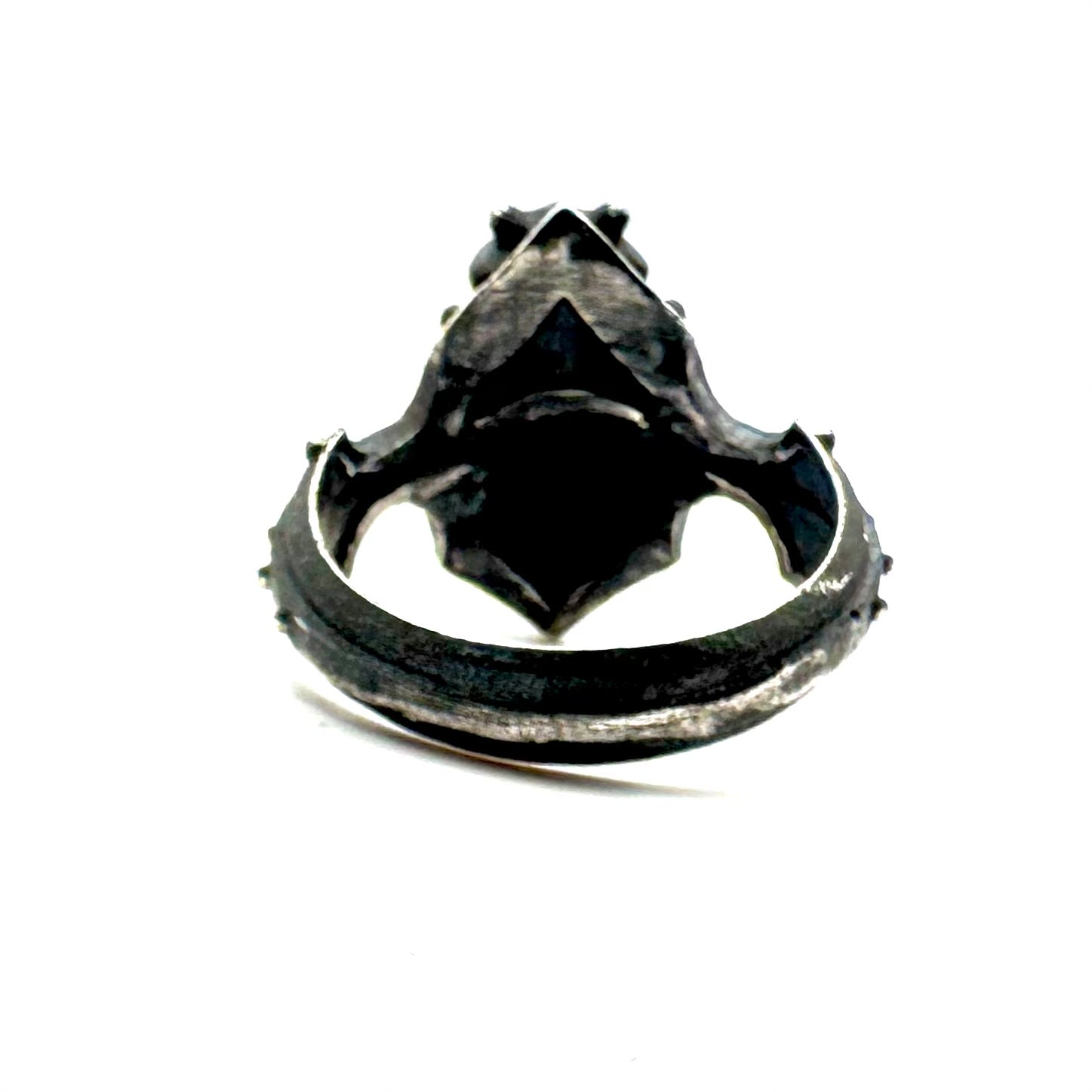 The Guardian Ring is handcrafted in sterling silver with a bronze accent, ensuring high-quality and durability. Each piece is given an antique finish. The surface is polished to a high shine, while the recessed areas maintain their darkened patina, creating dramatic contrast that highlights the detailed gargoyle design. Please allow for slight variations in oxidized finishes as each piece is individually handcrafted.