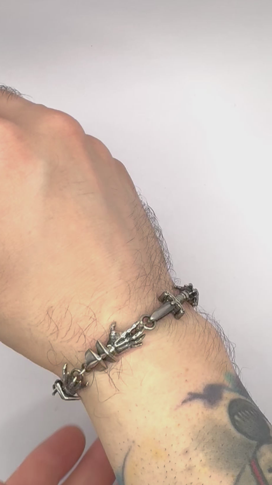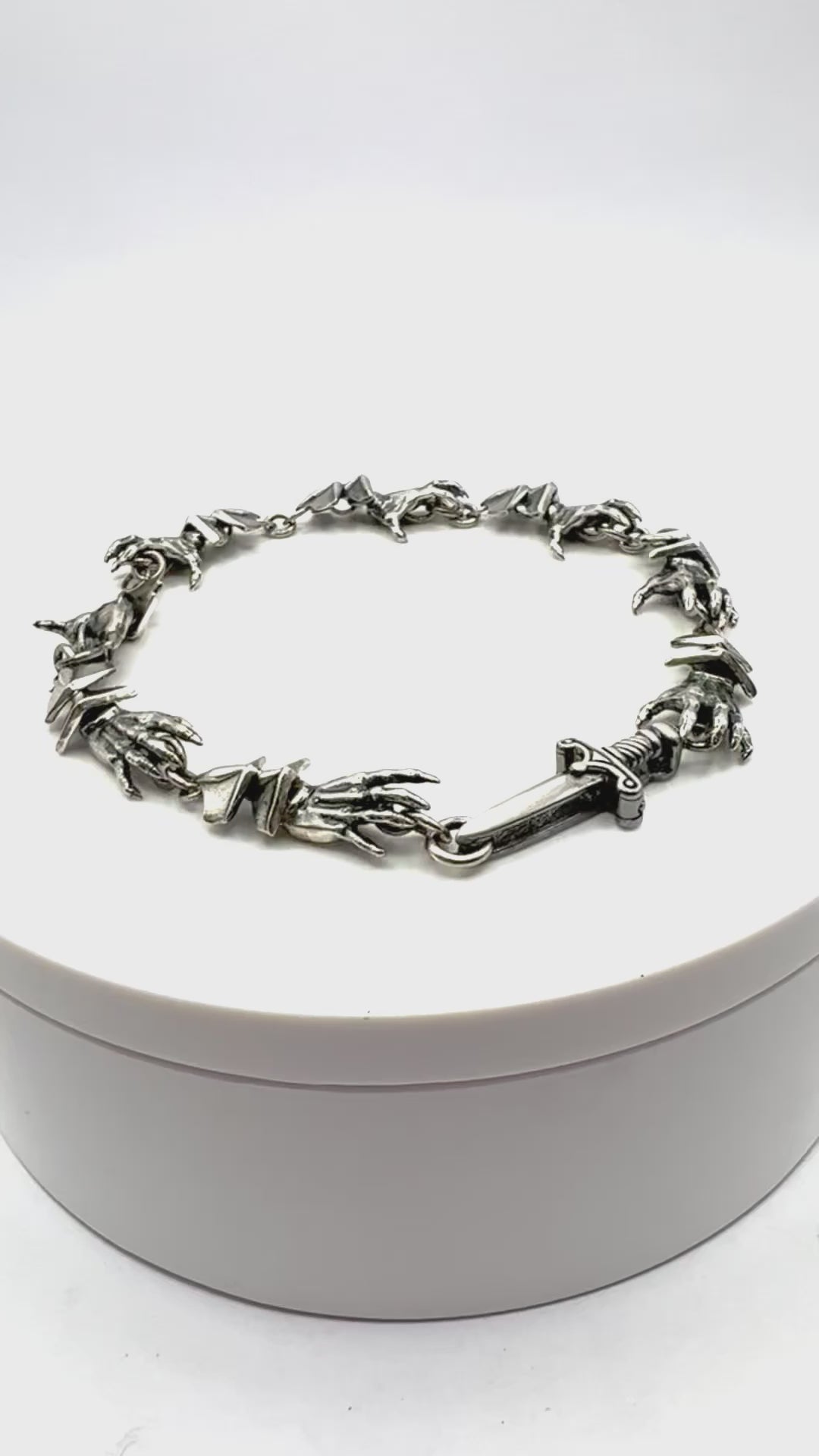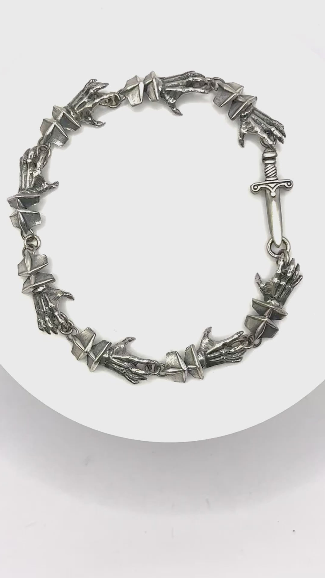 Bracelet clasps in the front with a sterling dagger clasp. The claws don’t irritate the skin.