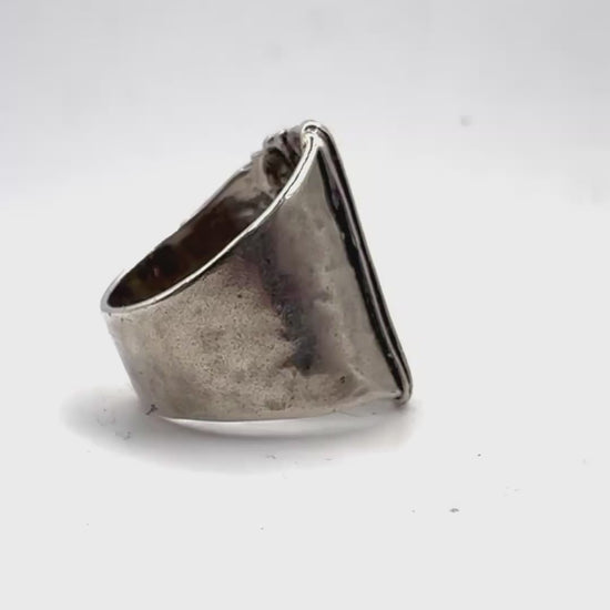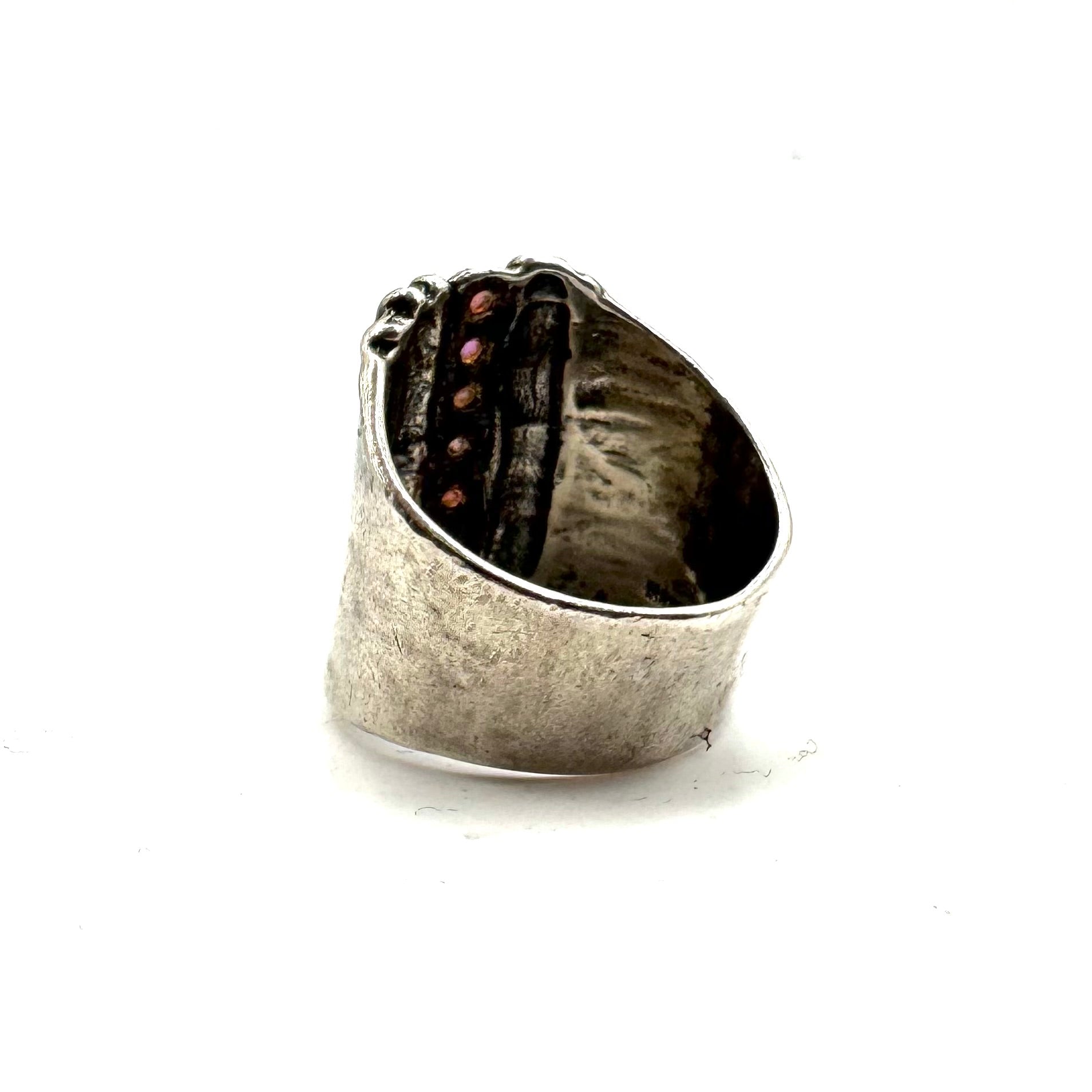 This ring is set with a beautifully saturated opal with insane color play. It reminds me of the Arken stone. Set into a unique variation of the sentinel ring. The ring has been hand textured to hold the oxidation. As it ages the oxidation will wear off on high points, but stay nice and dark in the recesses. This evolves the piece over time and makes it completely unique to the wearer.
