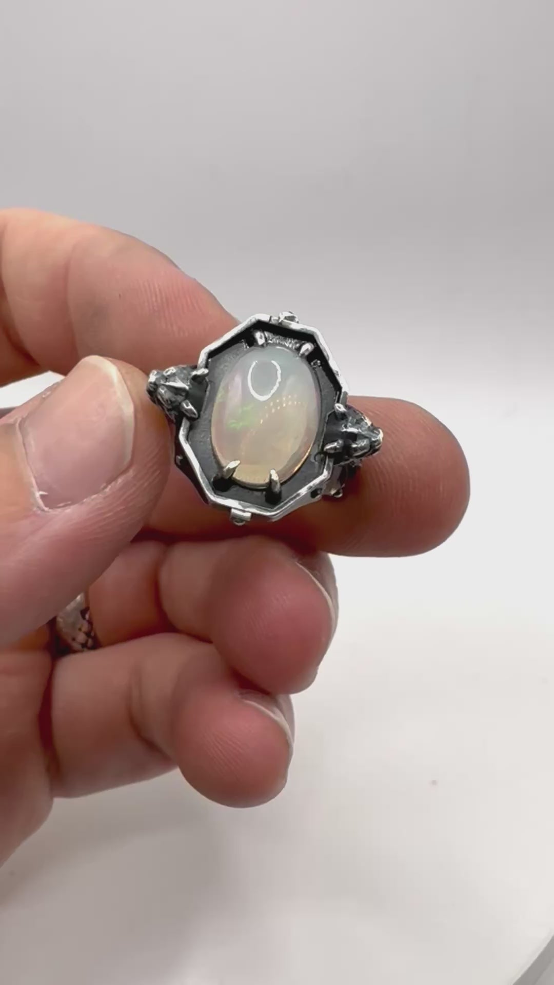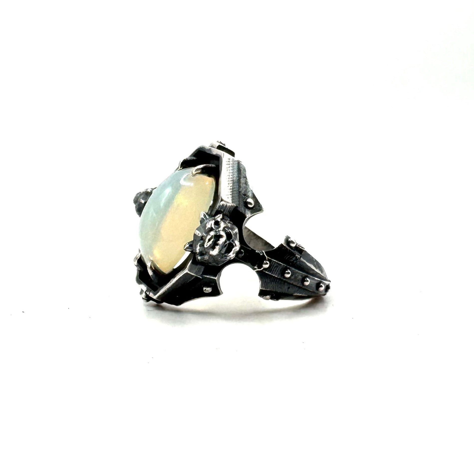 This sterling silver ring features a stunning welo opal set in a gargoyle-inspired design. The ring is a size 7, and its unique design combines elegance with a touch of fantasy. The opal's natural iridescence is an incredible contrast to the oxidized sterling silver.