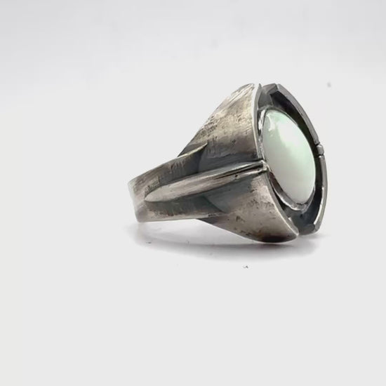 This ring is set with a beautifully saturated opal with insane color play. It reminds me of the Arken stone. Set into a unique variation of my spine ring. The ring has been hand textured to hold the oxidation. As it ages the oxidation will wear off on high points, but stay nice and dark in the recesses. This evolves the piece over time and makes it completely unique to the wearer.