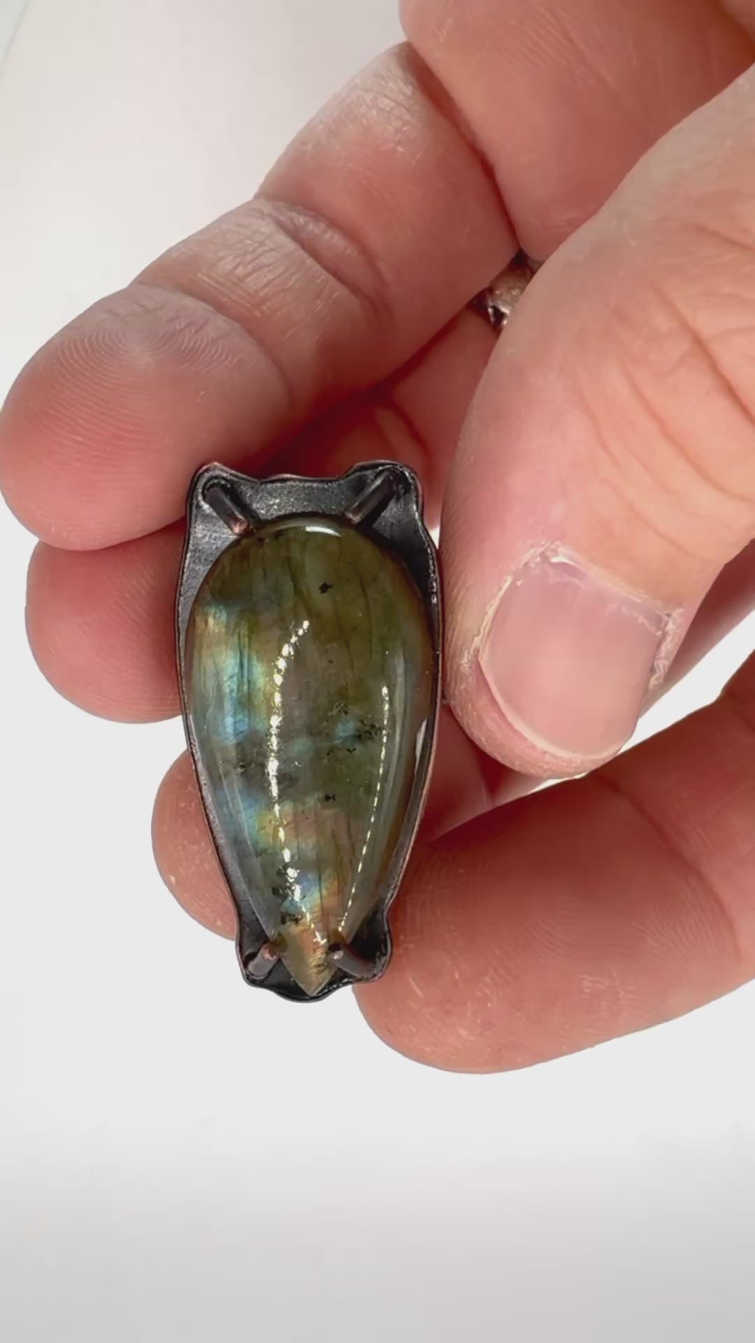 See into the eye of the oracle as the bones are thrown. Oxidized and then sanded to reveal the golden bronze color, while leaving the oxidation in some areas to create contrast. Crafted with meticulous attention to detail. Cast in solid bronze. Bone band, Set with a labradorite