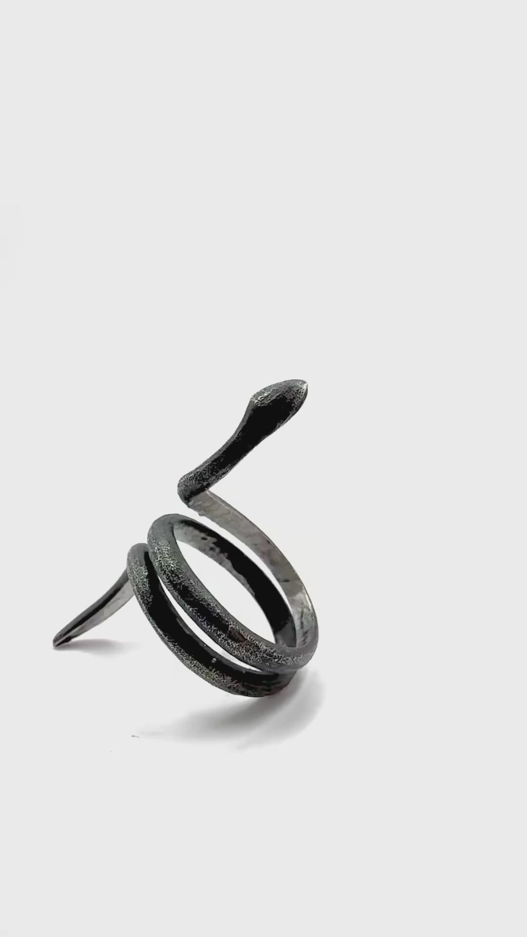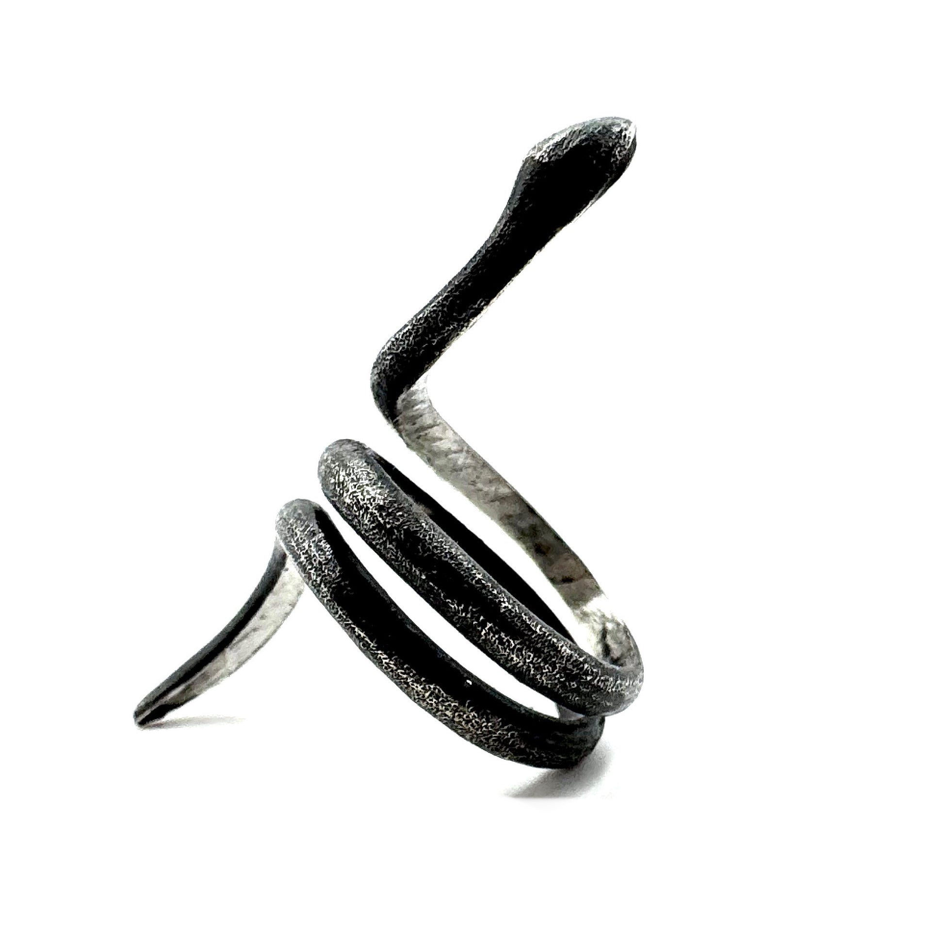 This elongated snake ring fits perfectly as a statement ring or even as a midi ring on the first knuckle. The band is hand textured with a stipple pattern to give the surface a nice tactility and the look of snake skin on this band. The inside of the ring is sanded smooth for ultimate comfort.