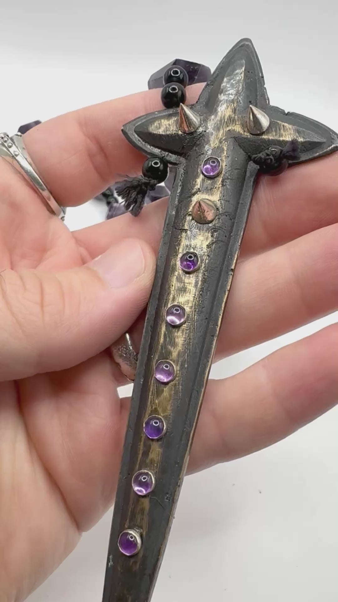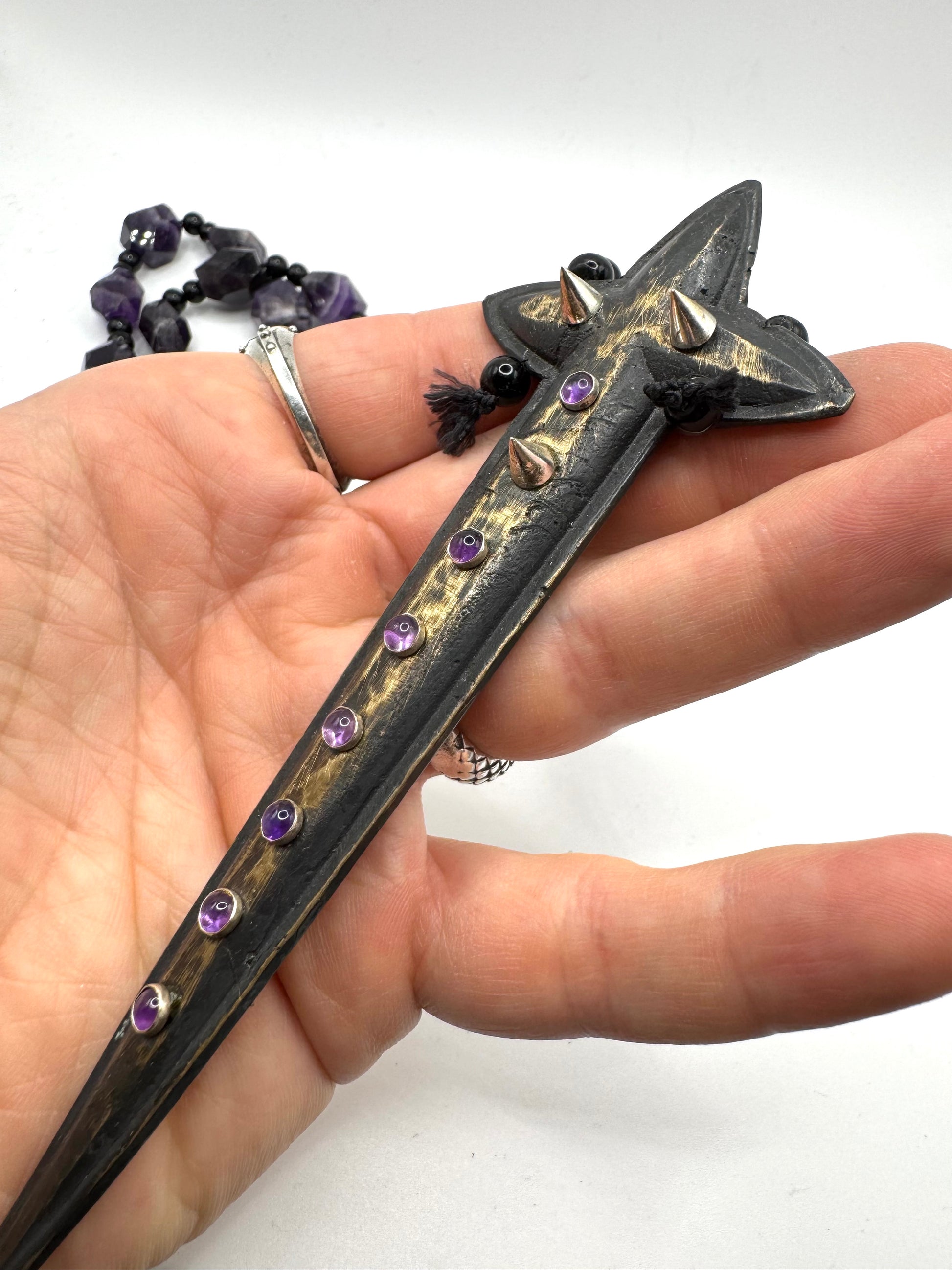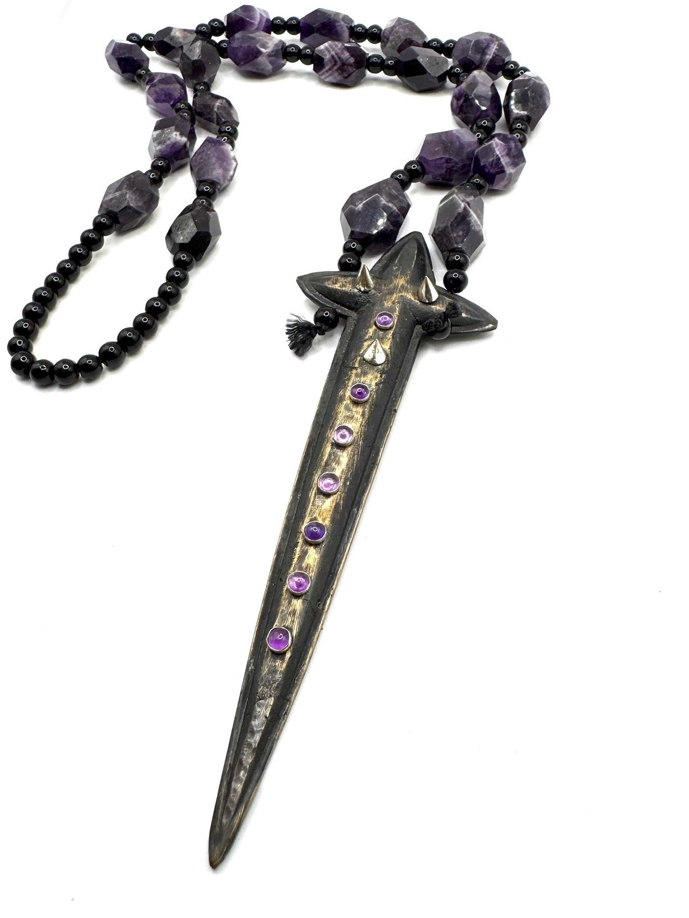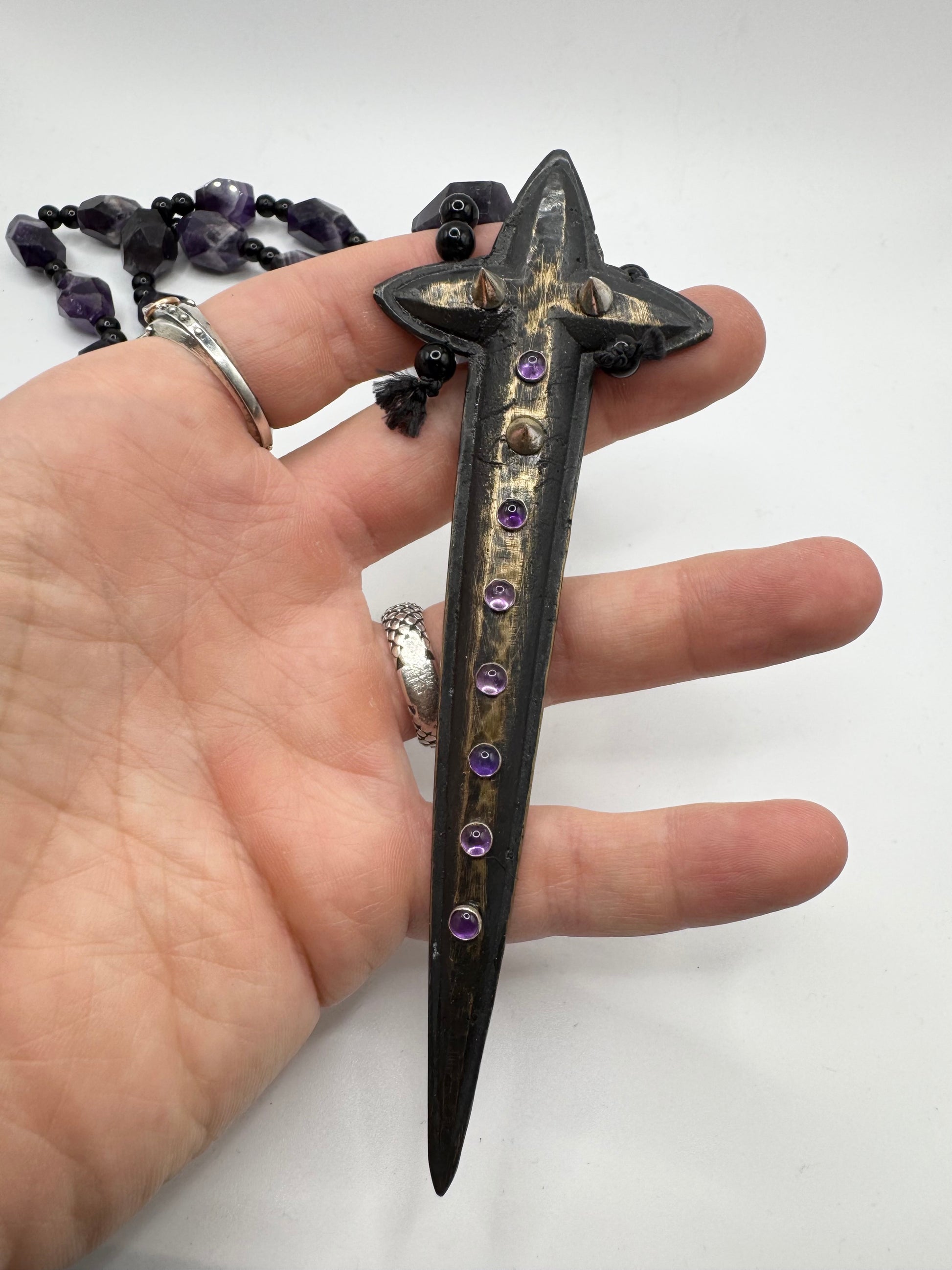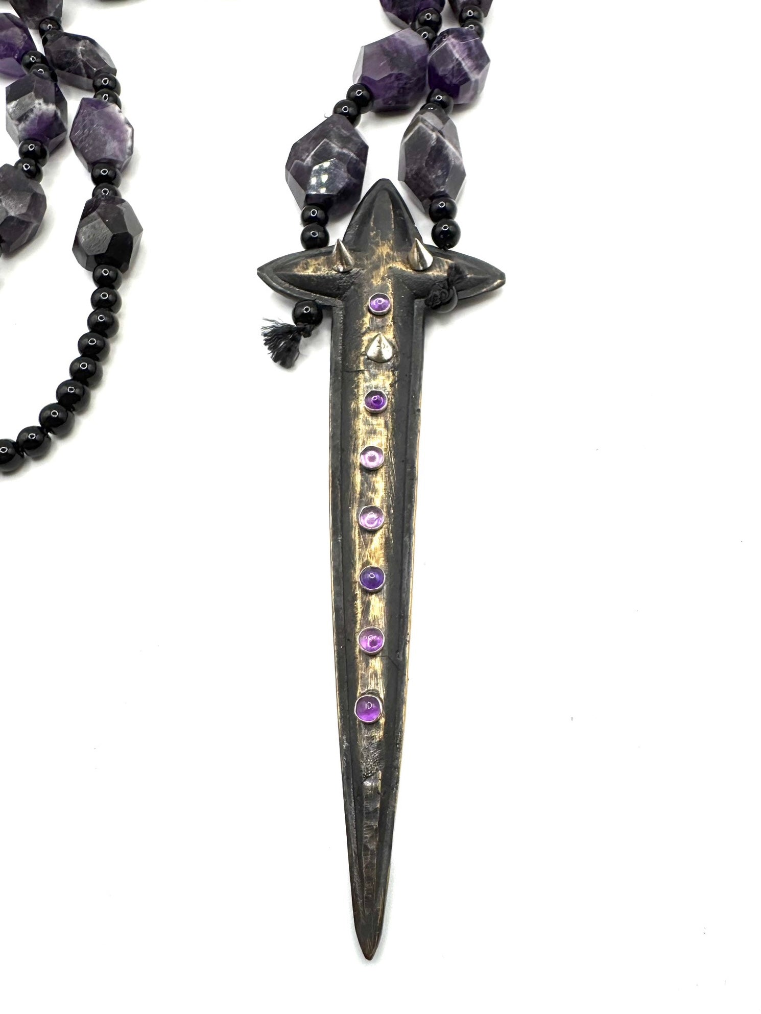 This one of a kind cross necklace is inspired by the silhouette of swords and the necklace itself is inspired by rosaries with alternating beads that can be used for meditative practice. The pendant is made of bronze and amethyst stones set into sterling silver with silver spikes and measures about 6 inches or so. Measures 26” long so it can be put over the head without a clasp. The beads are black onyx and amethyst.