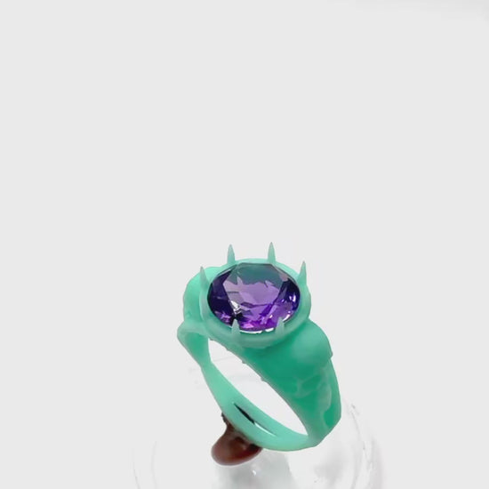 This is a part of the TO BE CAST series. Buying this ring in a designated size will reserve that size for your order. This is a one of a kind ring and will be made to order in your desired size in sterling silver and set with the amethyst pictured in the setting. This version of the ring is the WAX model, BUT it will be cast in STERLING SILVER at my foundry.