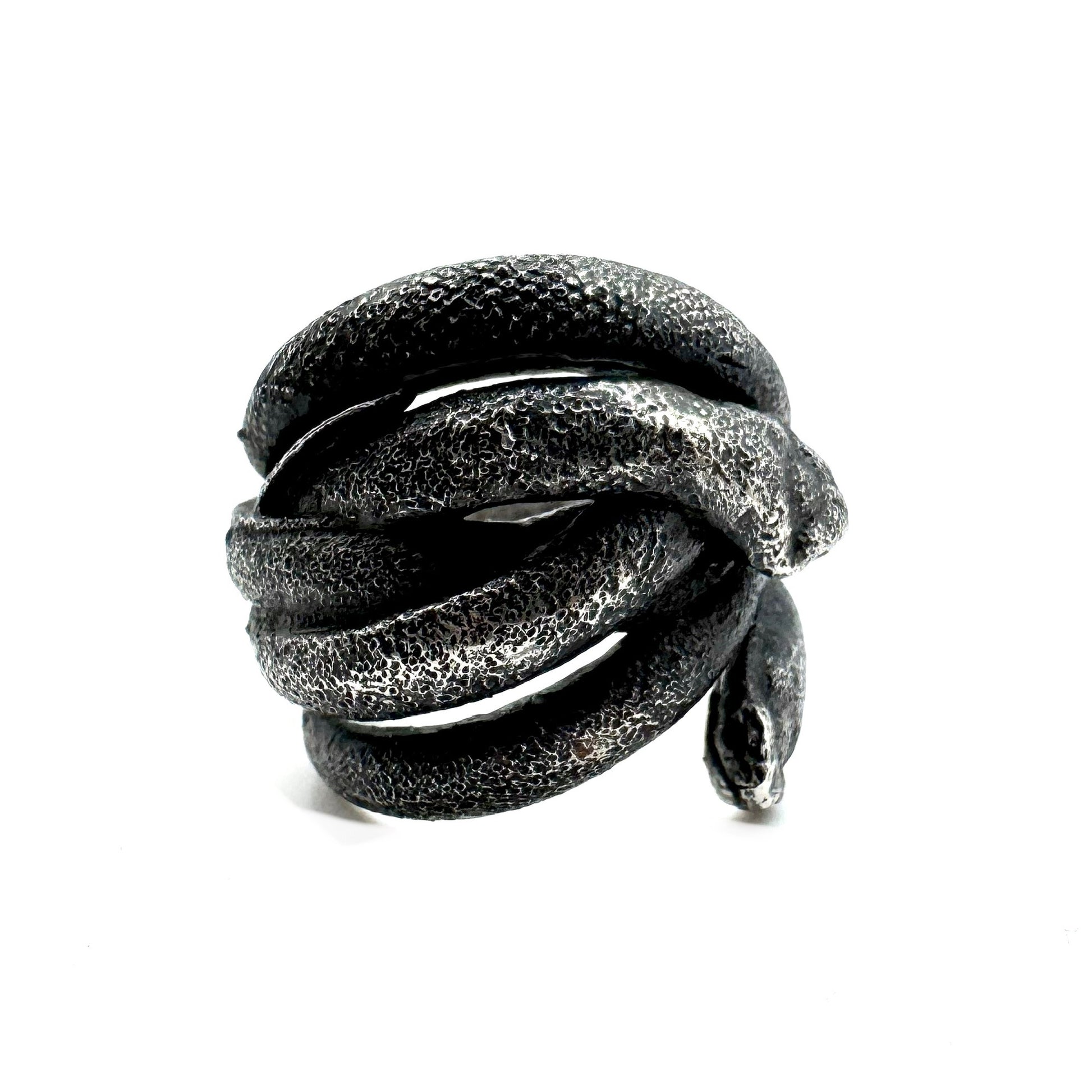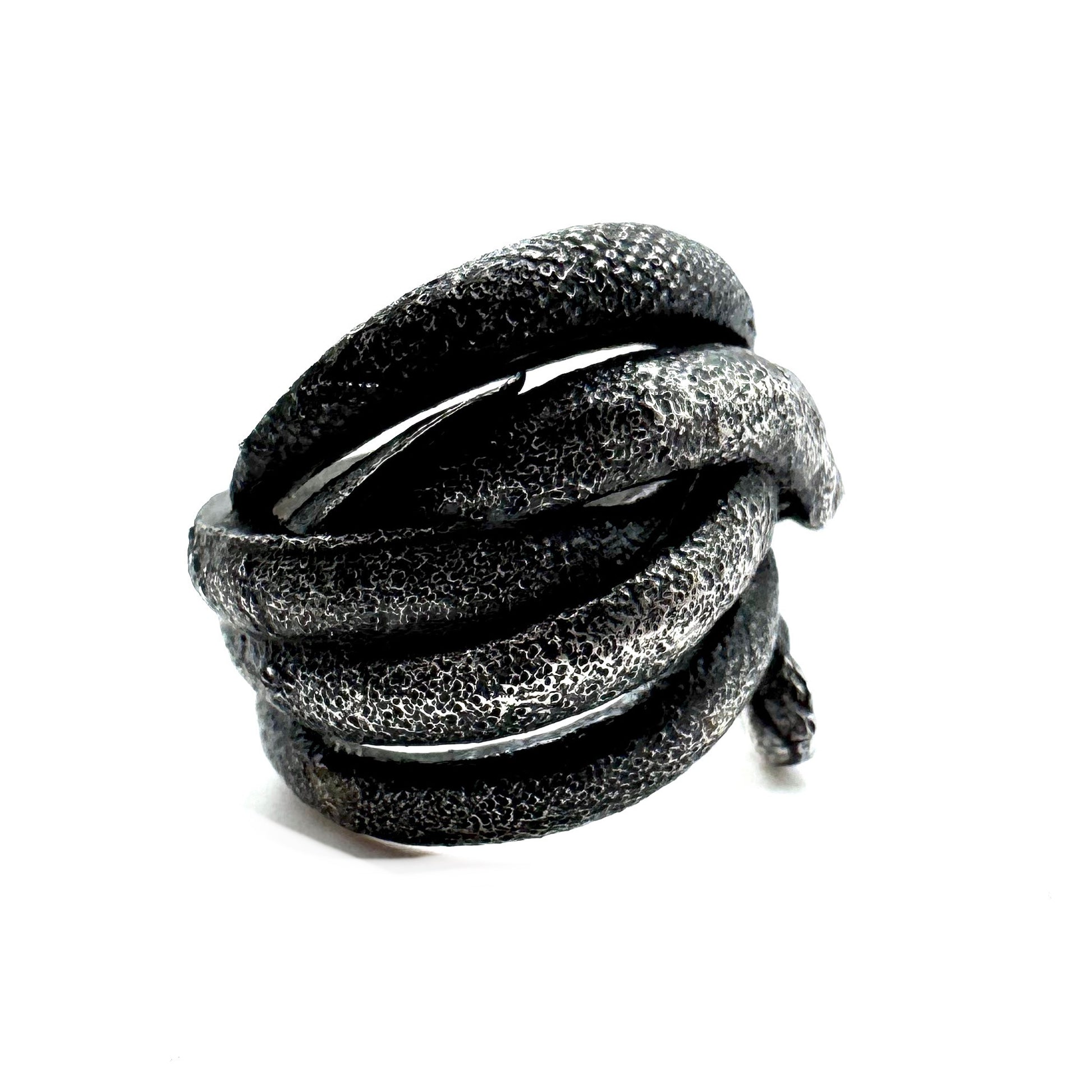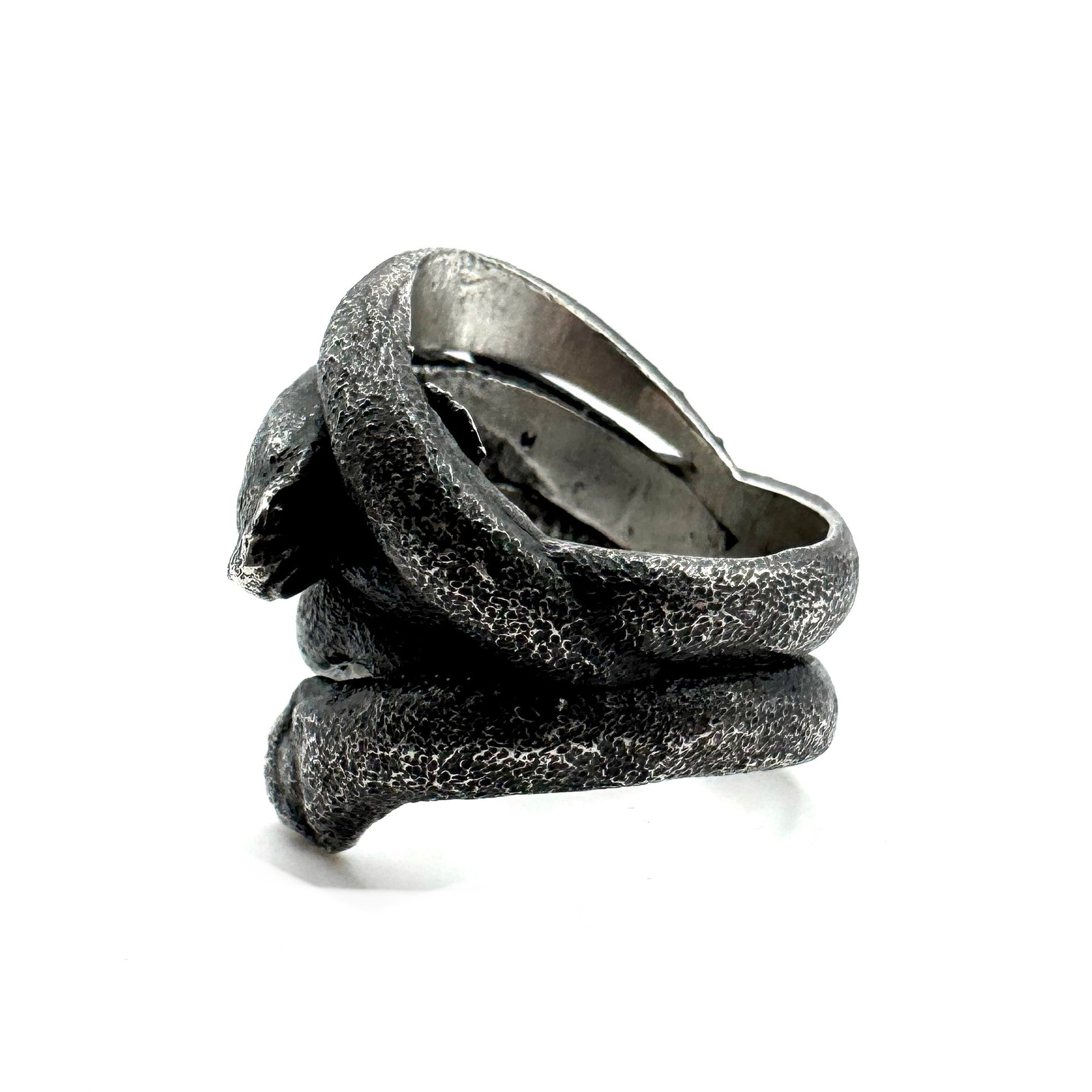 This snake ring is inspired by the idea of Ouroboros, the beginning and the end intertwining. The band is hand textured to look like snake skin and the inside of the band is sanded smooth for a comfortable finish.