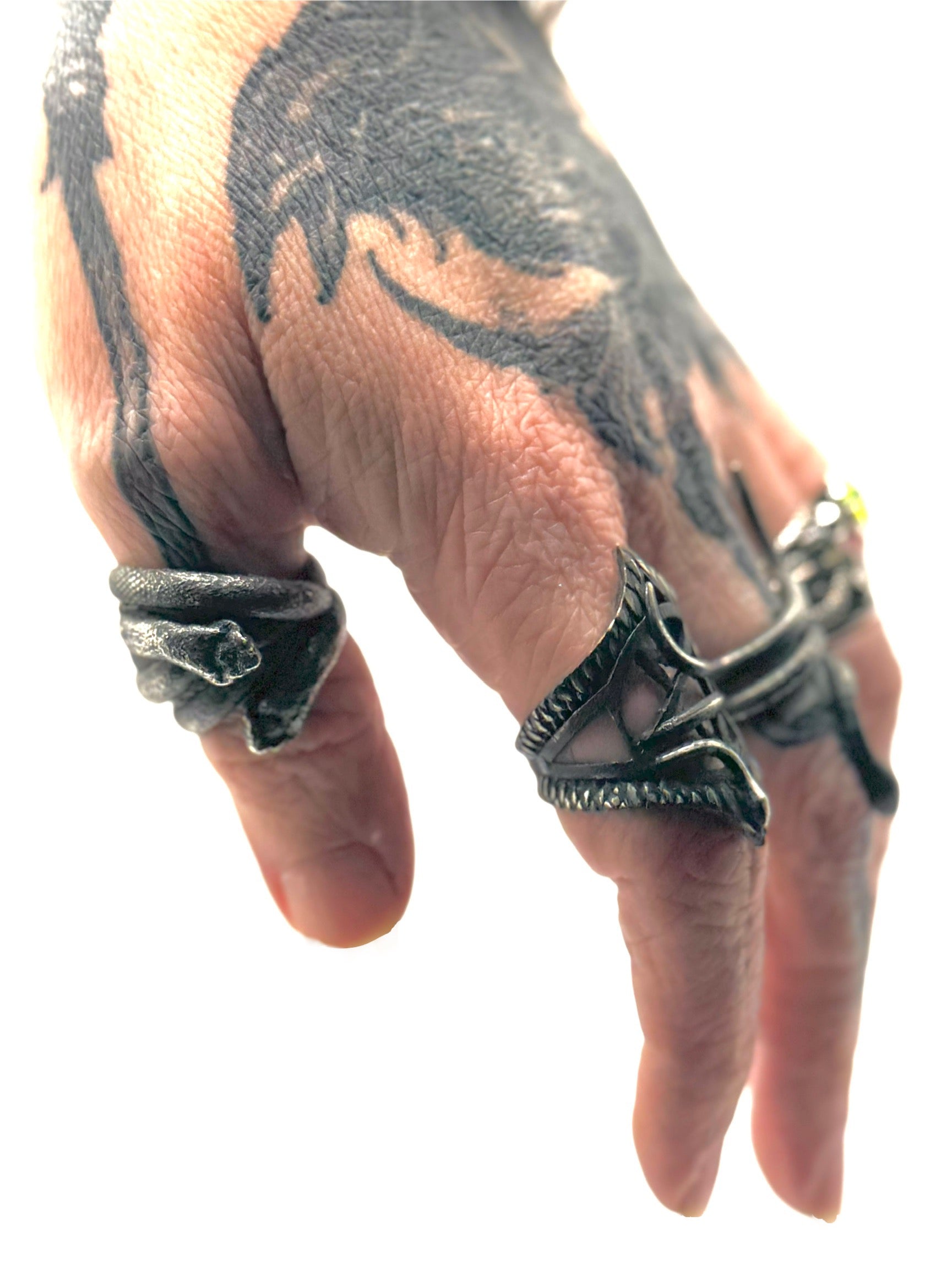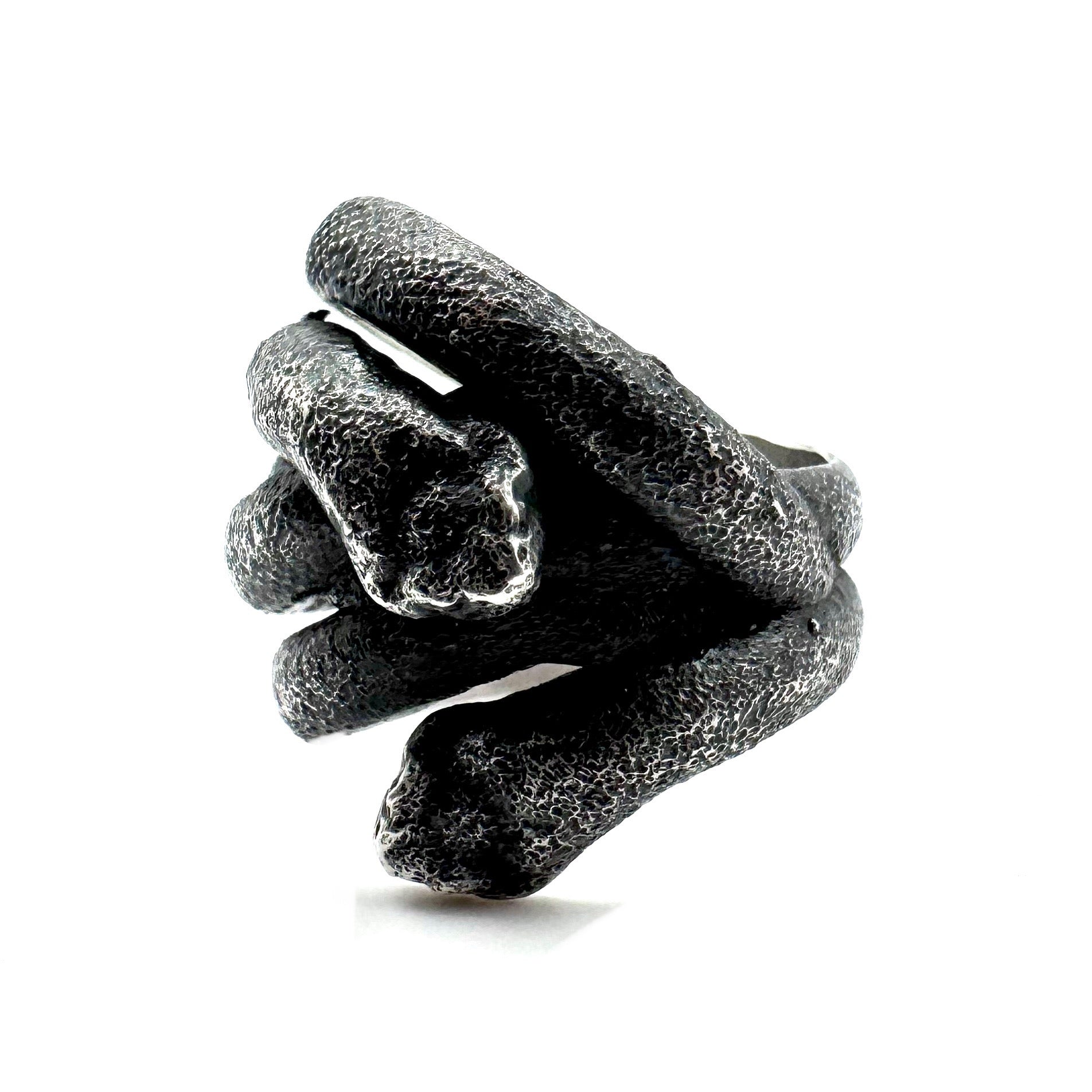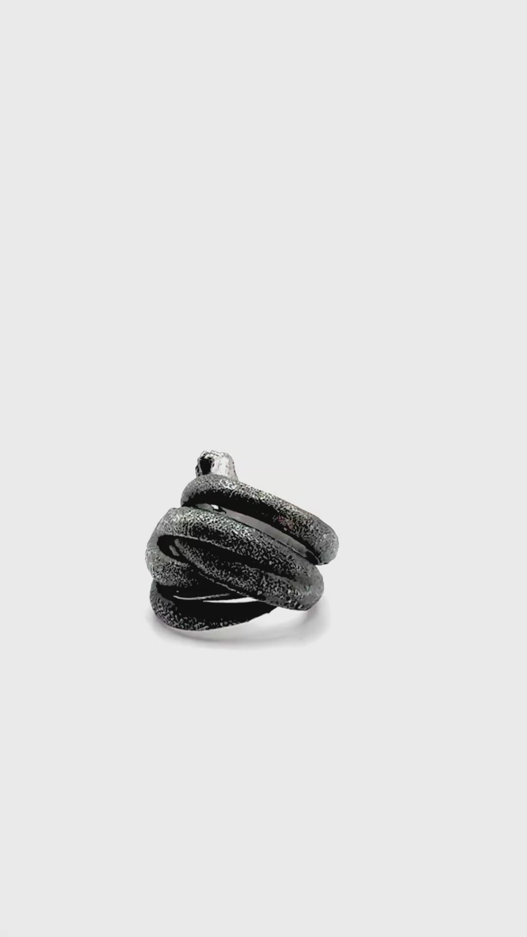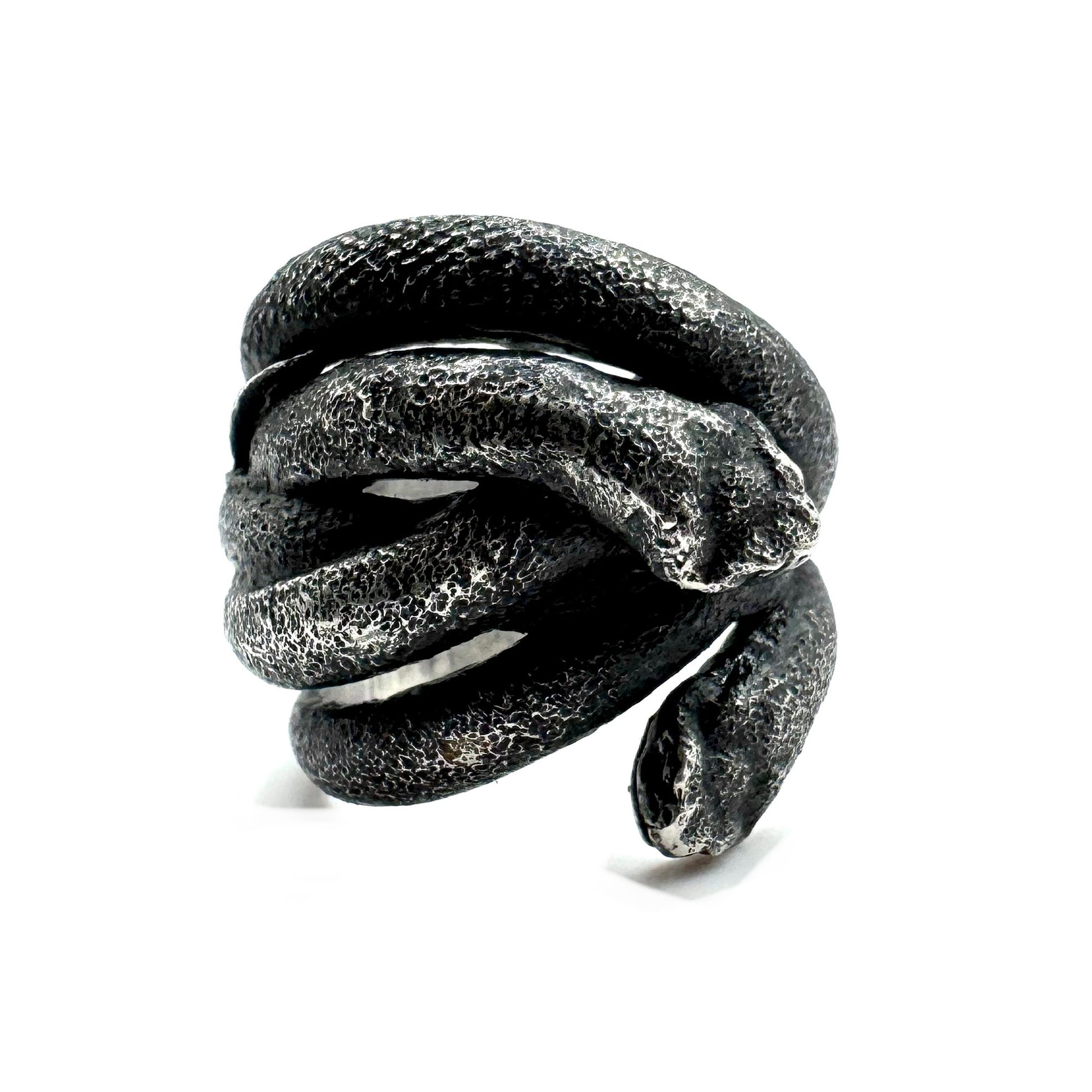 This snake ring is inspired by the idea of Ouroboros, the beginning and the end intertwining. The band is hand textured to look like snake skin and the inside of the band is sanded smooth for a comfortable finish.