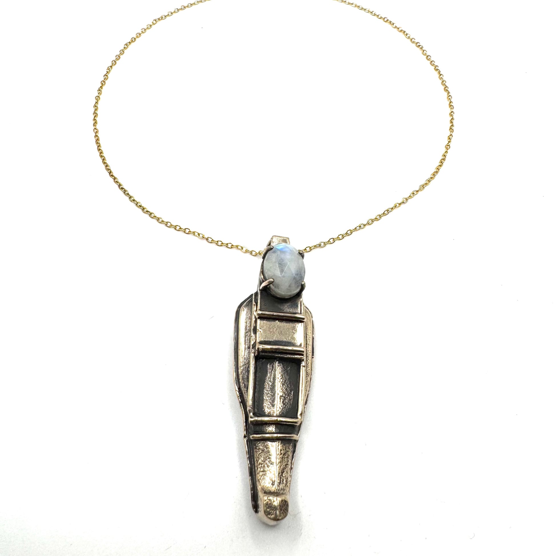 This talisman was inspired by Egyptian ushabti, which were used in ancient times. They represented servants you could take with you in the afterlife and were found in burial tombs. Oxidized and then sanded to reveal the golden bronze color, while leaving the oxidation in some areas to create contrast. Crafted with meticulous attention to detail. Cast in solid bronze. Set with a prehnite. This piece measures about 3” long